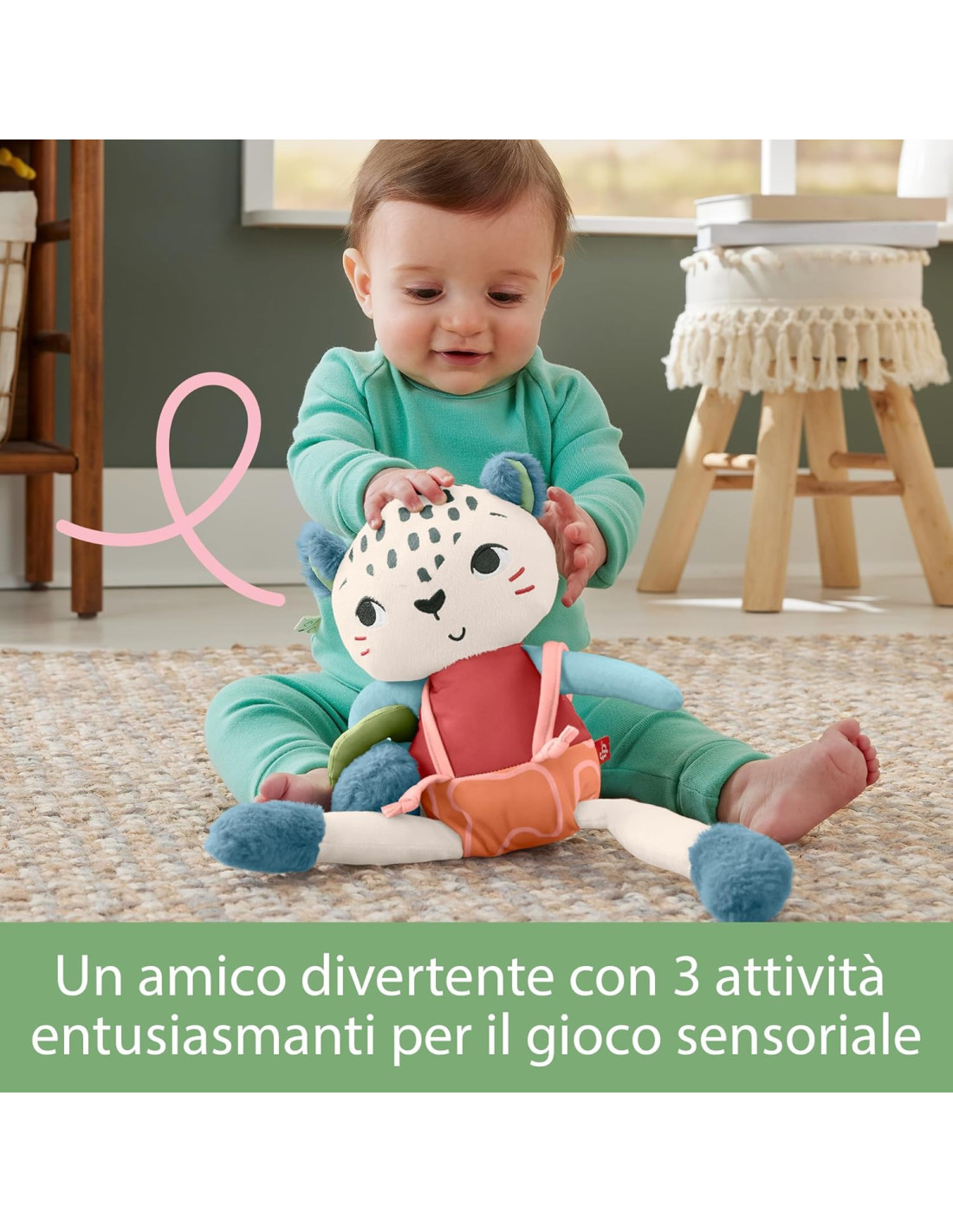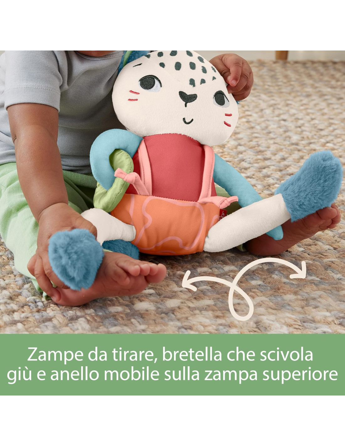 Ispirato agli animali indicati dal WWF, il giocattolo sensoriale per bambini Leopardina delle nevi Planet Friends di Fisher-Price utilizza un tessuto realizzato con il 95% di plastica riciclata da post-consumo ed e' contenuto in una confezione certificata FSC a sostegno di una silvicoltura responsabile. Questo giocattolo peluche presenta tessuti satinati, morbidi stivaletti fruscianti e colori a contrasto elevato per stimolare i sensi del tuo bimbo. Le divertenti attivita' motorie complesse includono zampe da tirare, una bretella che scivola gia' e un morbido anello che scorre su per la zampa superiore, per permettere al tuo bimbo di esplorare. Questo giocattolo aiuta a infondere un senso di sicurezza al tuo bambino sia in casa che in viaggio, ed e' lavabile in lavatrice.