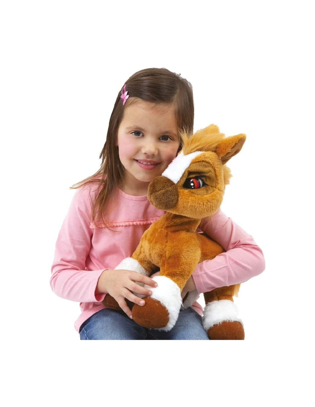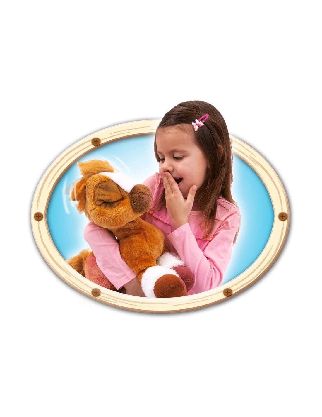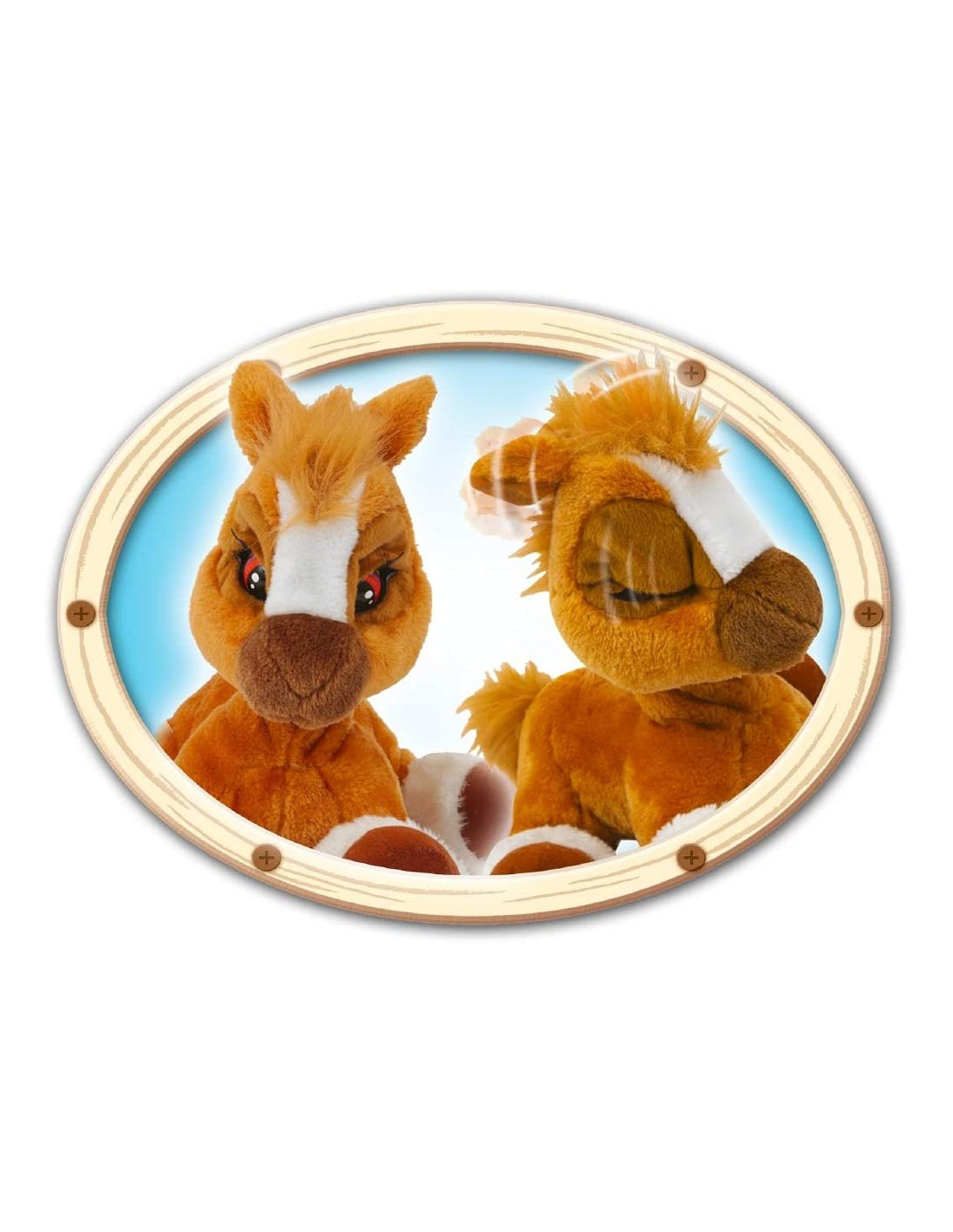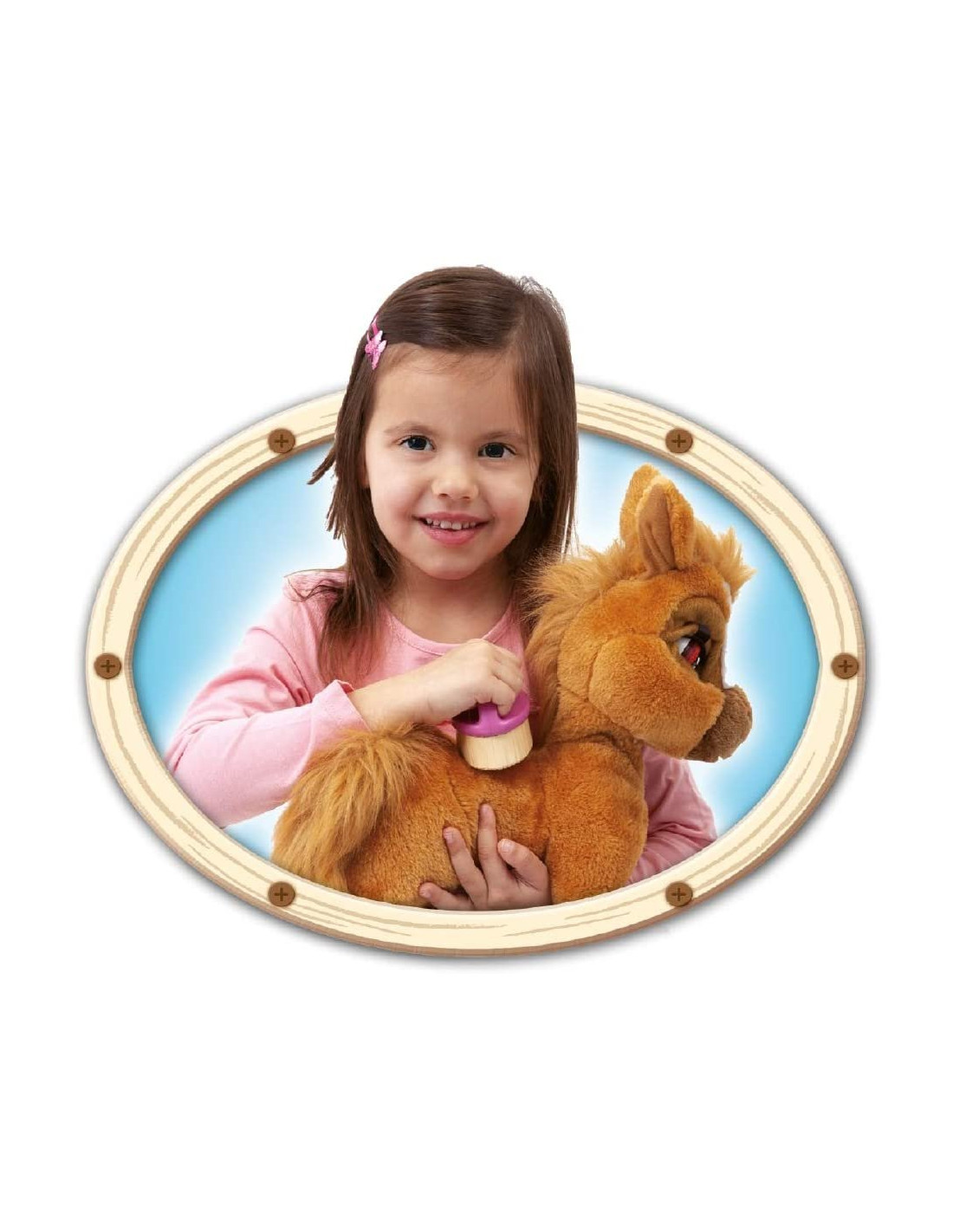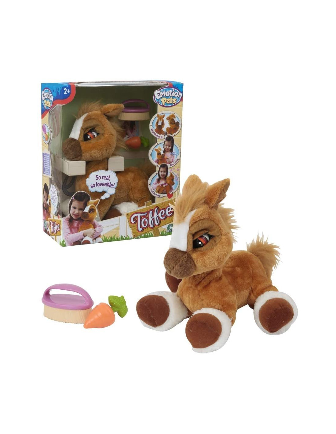 Toffee è un dolce pony di 38 cm di altezza, color caramello, morbido da coccolare Toffee è pronto a giocare, sbatte le palpebre e ti chiama Quando Toffee sente un forte rumore nitrisce spaventato, chiude gli occhi e gli tremano le orecchie Toffee ama essere strigliato con la sua spazzola, e quando lo fai ti ringrazia sbattendo le palpebre e muovendo le orecchie, felice Quando Toffee ti chiama, potrebbe aver fame dagli la sua carota e vedrai come la mangerà di gusto, una volta sazio, nitrirà per ringraziarti, muovendo le orecchie e sbattendo le palpebre Età minima raccomandata: 2 anni