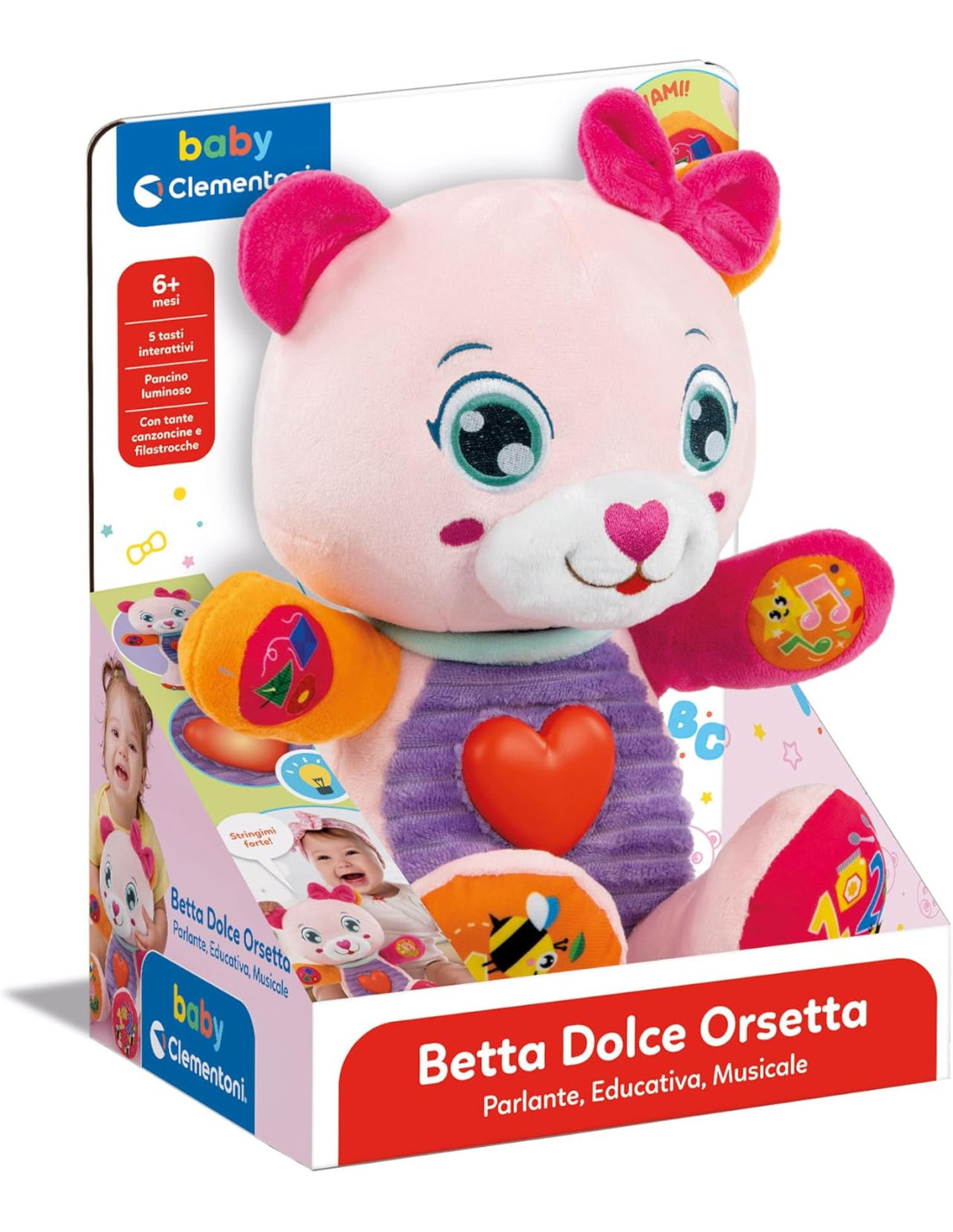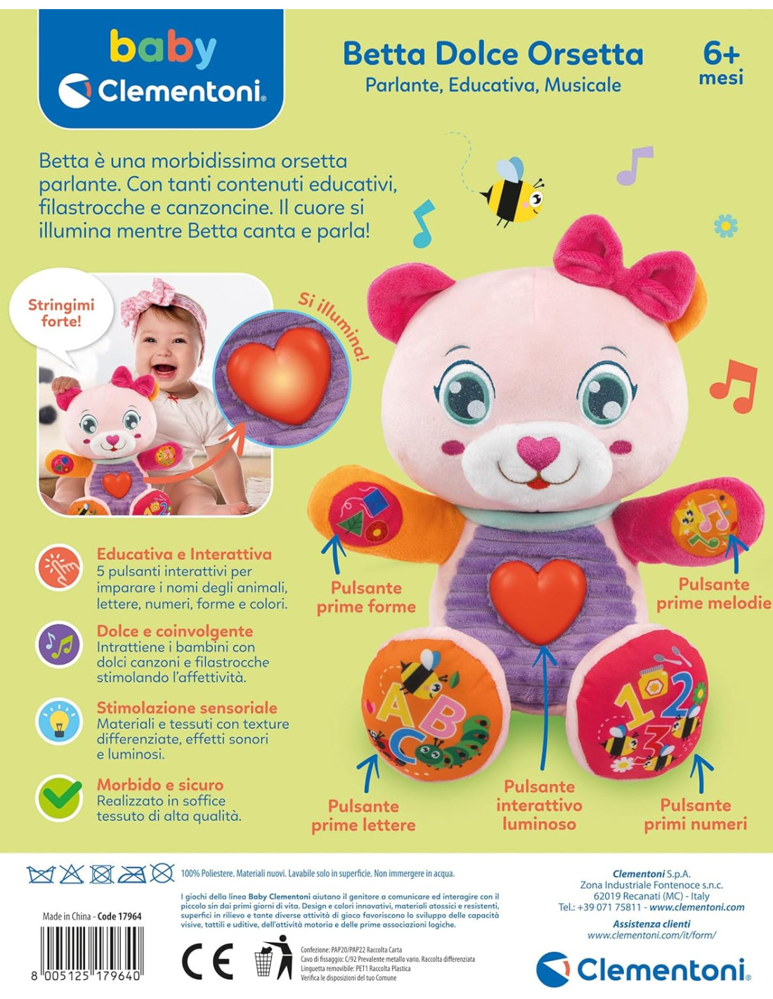 Clementoni- Baby Betta Dolce Orsetta-Peluche Parlante Interattivo, Educativo Prima Infanzia Bambini 6 Mesi, Gioco Pupazzo Neonato, Musicale, Luci e Suoni, con Batterie, in Italiano, 17964, Multicolore