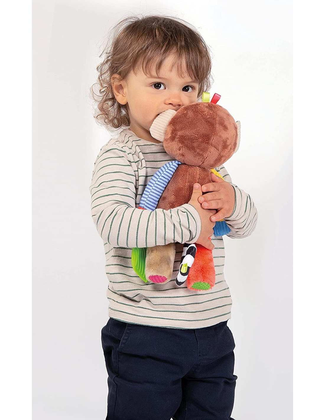 SVILUPPO MULTISENSORIALE: i tessuti con texture diverse invitano all'esplorazione con le mani per sperimentare varie sensazioni tattili, piacevoli e stimolanti. Alle diverse parti del corpo corrispondono diversi sonaglini ed effetti sonori: per stimolare l'udito, la curiosità e una prima comprensione del rapporto causa-effetto.