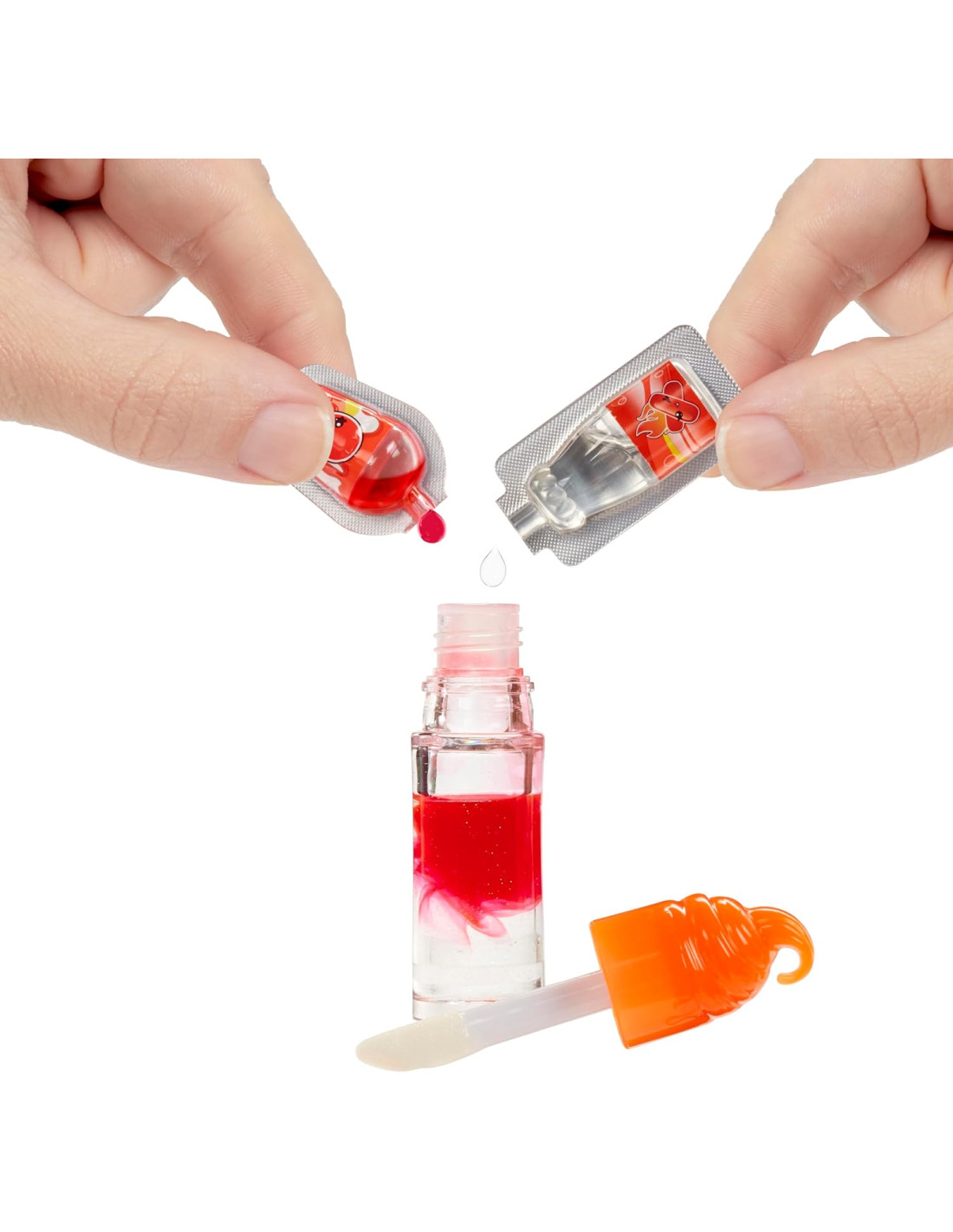 KIT LIP GLOSS FAI DA TE: include un colore, un profumo e una base trasparente. Versa i liquidi profumati e colorati dalla bottiglia di soda e dalla bevanda nel tubetto, mescola con il cucchiaio incluso, sigilla e agita per rivelare il tuo lucidalabbra