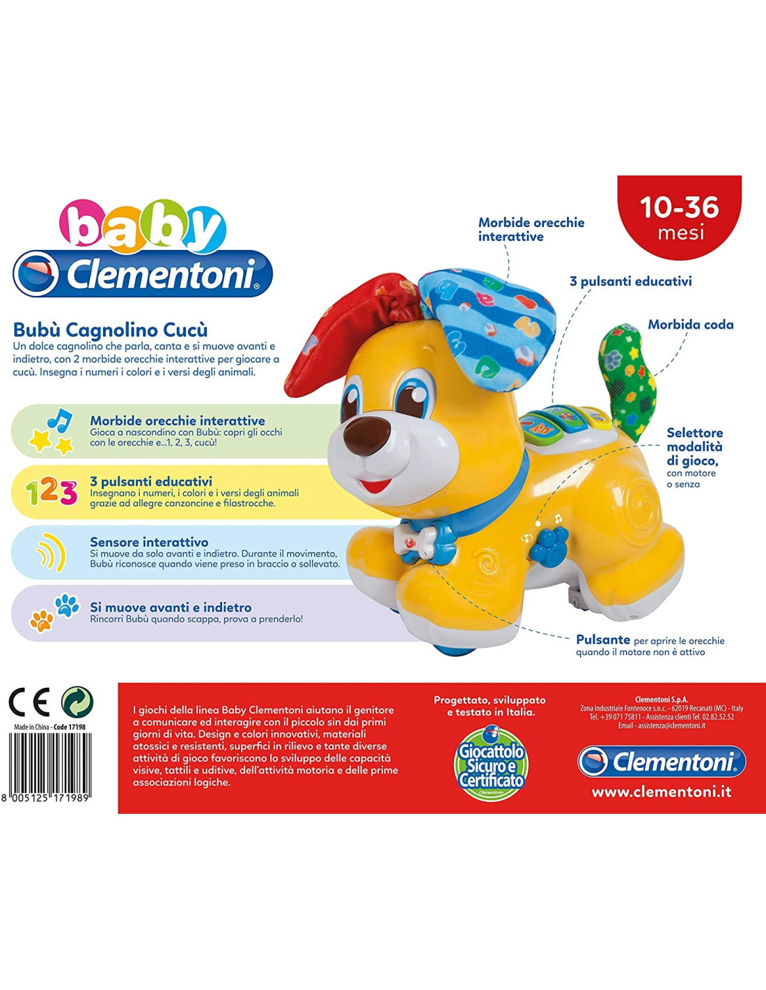 Un dolce cagnolino interattivo che cammina e gioca a fare cucù con tanti pulsanti per imparare e divertirsi.