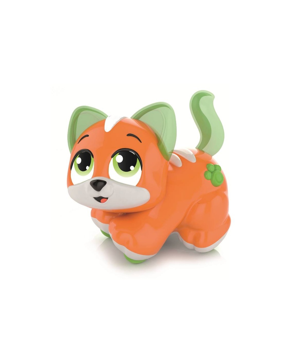 Il gattino si muove grazie a un meccanismo a retrocarica. I due pulsanti sul capo e sul muso riconoscono le carezze del bambino: quando vengono sfiorati il cucciolo parla, canta, mugola e dà bacini.