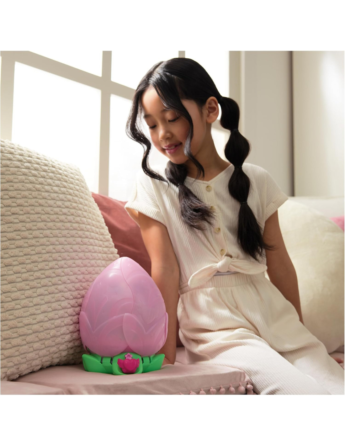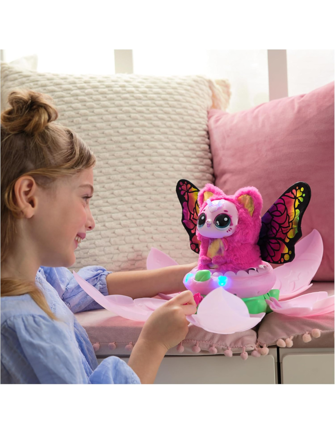 ENTUSIASMANTI TRASFORMAZIONI Annaffia il fiore con amore finché i petali si aprono, rivelando un adorabile bruco. Quando le sue antenne si illuminano riposizionalo nel fiore e guarda il fiore sbocciare e diventare farfalla.