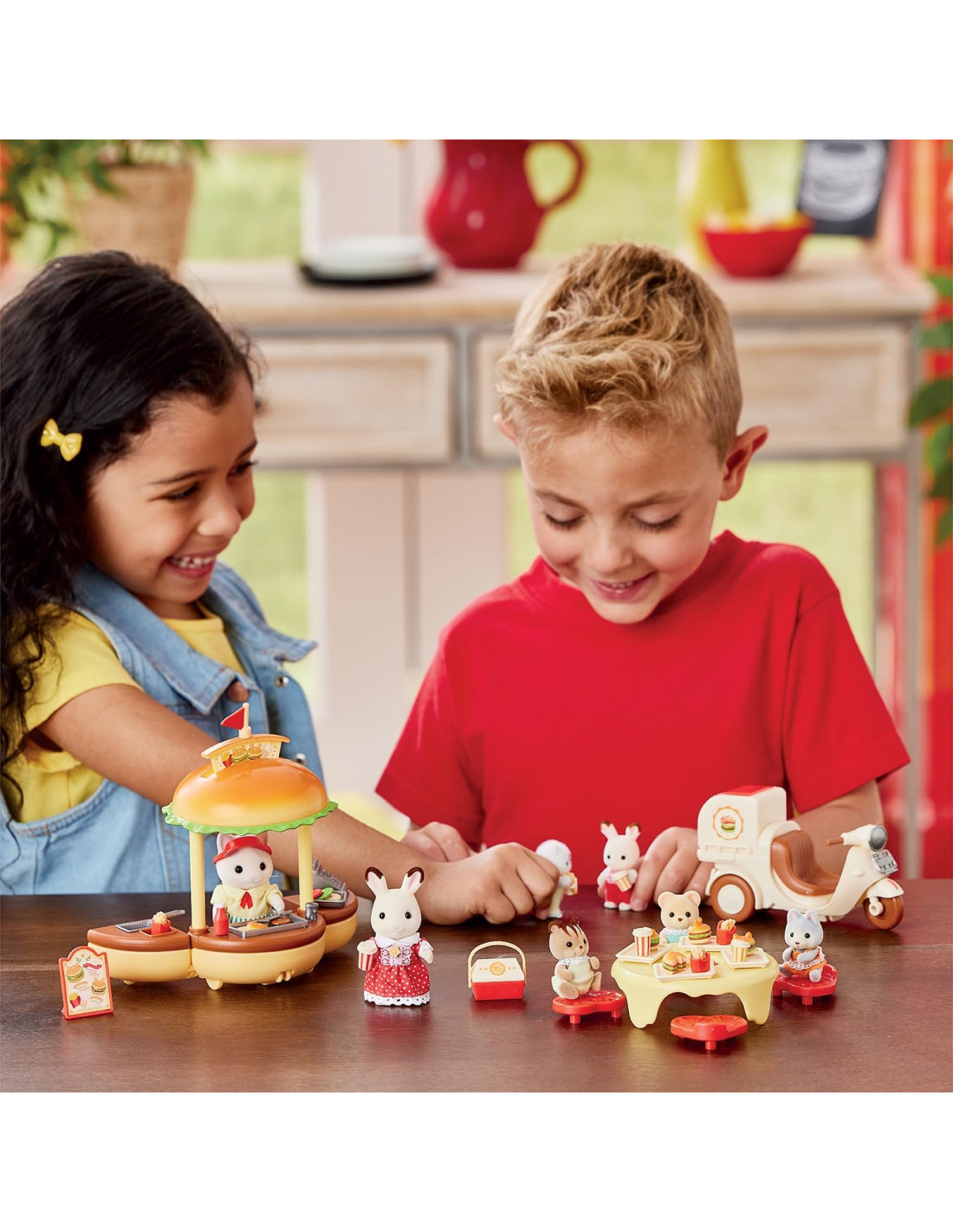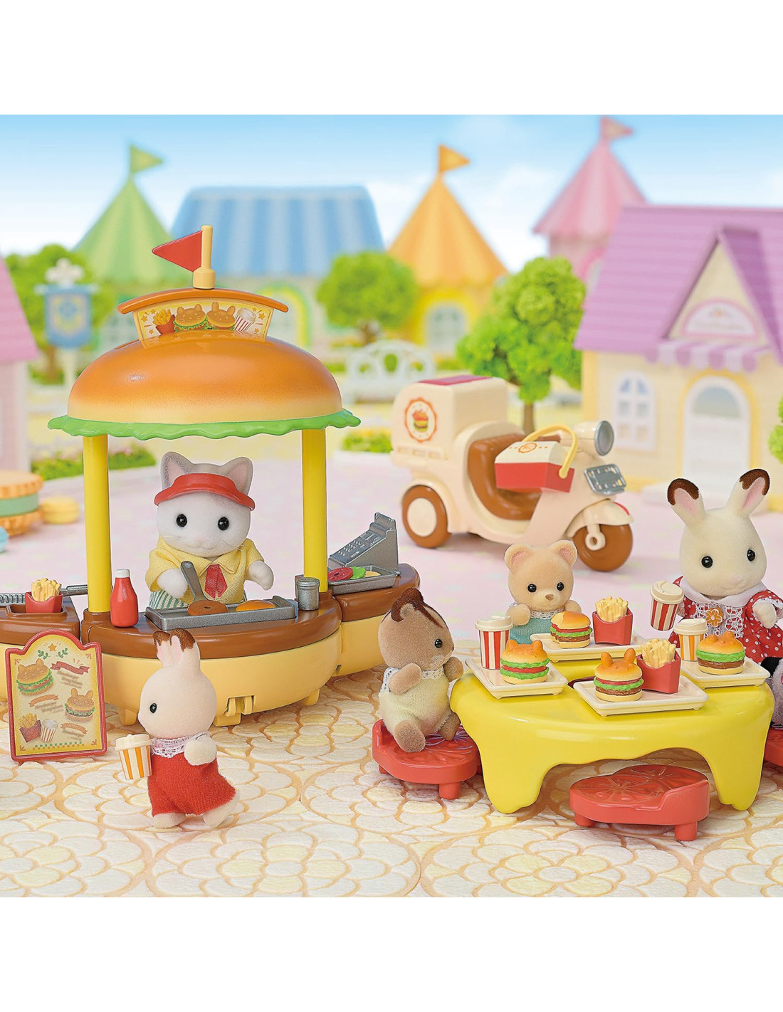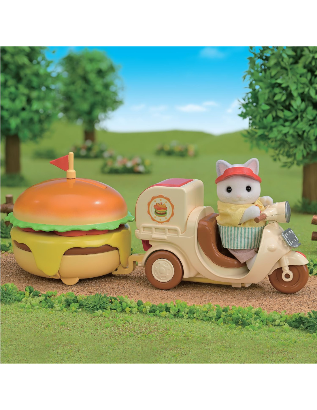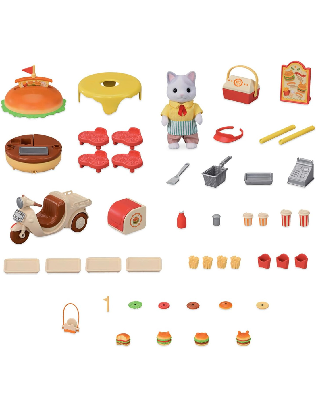 Il set contiene un negozio di hamburger a forma di hamburger, più una bicicletta per le consegne e il padre Gatto Latte Smonta il grande hamburger per creare vari oggetti come un supporto per hamburger, un tavolo e delle sedie. Puoi divertirti a grigliare le polpette e friggere le patatine calde. Viene fornito con oltre 30 accessori tra cui graziosi hamburger con panini a forma di orecchie di gatto e bevande. Stimola il gioco di ruolo fantasioso per i bambini. Adatto a partire dai tre anni in su