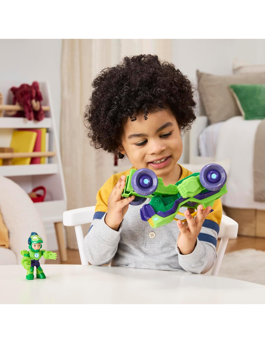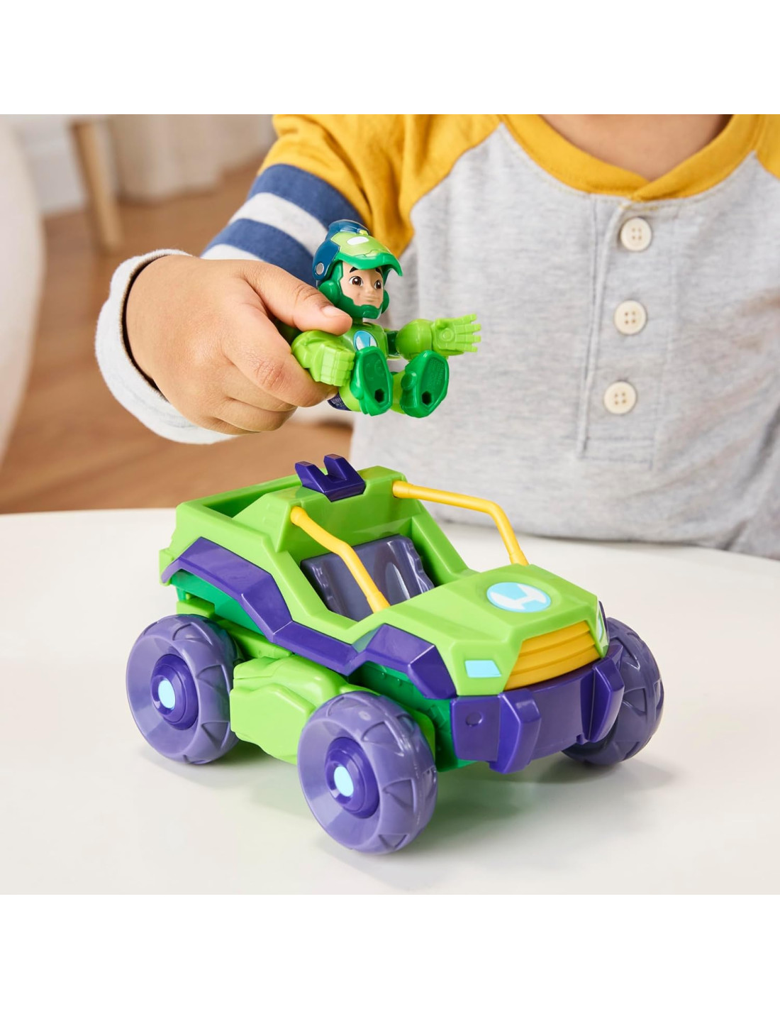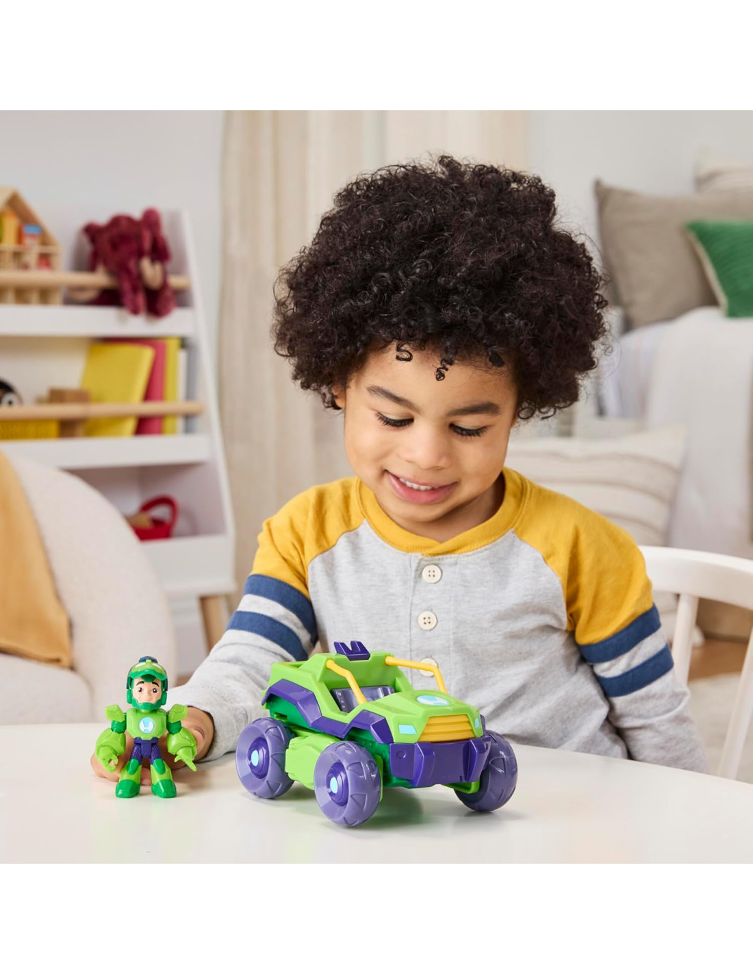 DESIGN ISPIRATO ALLA SERIE: l'armatura Mech e l'auto da corsa giocattolo dell'action figure snodabile del supereroe Iron Hulk presenta design e decorazioni ispirati alla serie "Iron Man e i suoi fantastici amici" su Disney Jr.