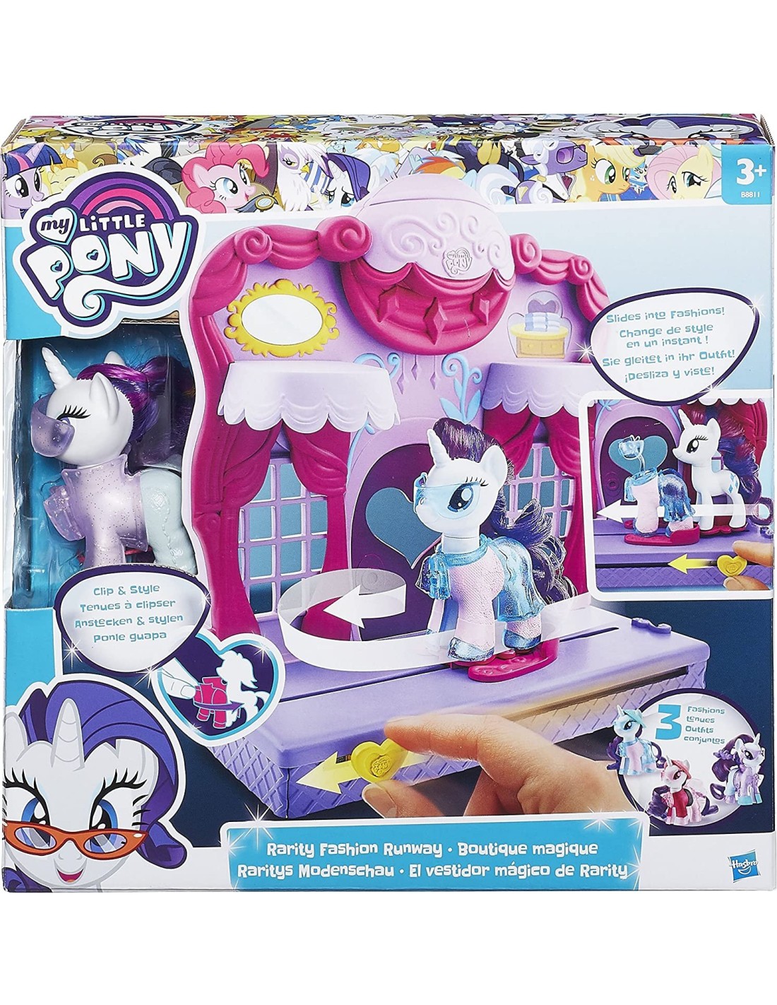 La boutique di Rarity è un gioiello di stile e tecnologia: grazie al meccanismo scorrevole, il pony può cambiare rapidamente i 3 ricchi abiti in dotazione per poi esibirsi impeccabile davanti alle sue amiche! Rendila super-elegante con i tanti accessori per farla ammirare da tutti al Gala del Galoppo! Tutti i vestiti possono anche essere indossati dai pony dell'assortimento Pony Fashion. Non adatto a bambini con età inferiore a 3 anni Contenuto della confezione 1 x playset, 3 x vestiti, 1 x bambola -Entra nel magico mondo dei My Little Pony -Ricchi abiti in dotazione -Meccanismo scorrevole Entra nel magico mondo dei My Little Pony Ricchi abiti in dotazione Meccanismo scorrevole