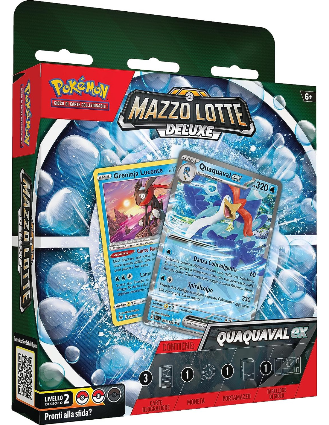 All'attacco con i giri e le piroette di Quaquaval-ex I Mazzi Lotte Deluxe del GCC Pokémon offrono una marcia ai giocatori pronti a mettersi alla prova, con strategie sofisticate e carte potenti Questo mazzo di 60 carte pronto per giocare include tre carte olografiche, tra cui una di Quaquaval-ex Troverai anche tanti accessori per giocare fin da subito: un tabellone di gioco per un singolo giocatore, un set di segnalini danno, una moneta, due segnalini, un portamazzo e una scheda strategica Include anche una carta codice per giocare con questo mazzo nel GCC Pokémon Live Che la lotta in versione deluxe abbia inizio Edizione in lingua italiana