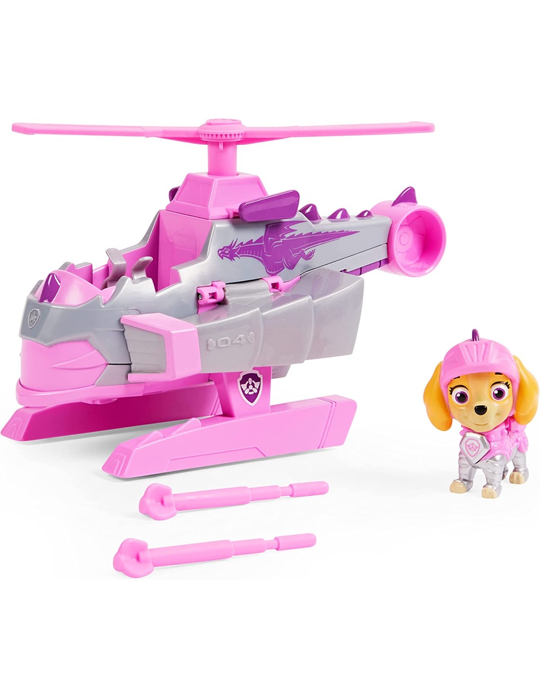 AVVENTURE PAW PATROL: unisciti a Skye per emozionanti missioni con il suo veicolo Paw Patrol Rescue Knights, con dettagli e design ispirati alla serie animata. PERSONAGGIO SKYE PAW PATROL: con la sua armatura Rescue Knights, Skye è pronta per essere posizionata e fissata alla guida del suo veicolo Paw Patrol. LANCIATORE PAW PATROL: spingi l'elica del veicolo Rescue Knights di Skye verso il basso per far spuntare il lanciatore, carica i proiettili e premi il pulsante per lanciarli. PER BAMBINI DAI 3 ANNI IN SU: il veicolo Rescue Knights di Skye e tutti i giochi Paw Patrol sono un buon regalo per i bambini dai 3 anni in su. Il veicolo Rescue Knights di Skye non richiede pile. CONTENUTO: 1 personaggio Skye, 1 veicolo Paw Patrol Rescue Knights, 2 proiettili