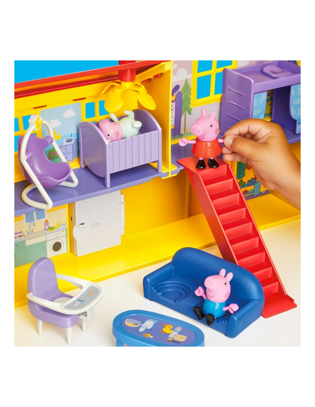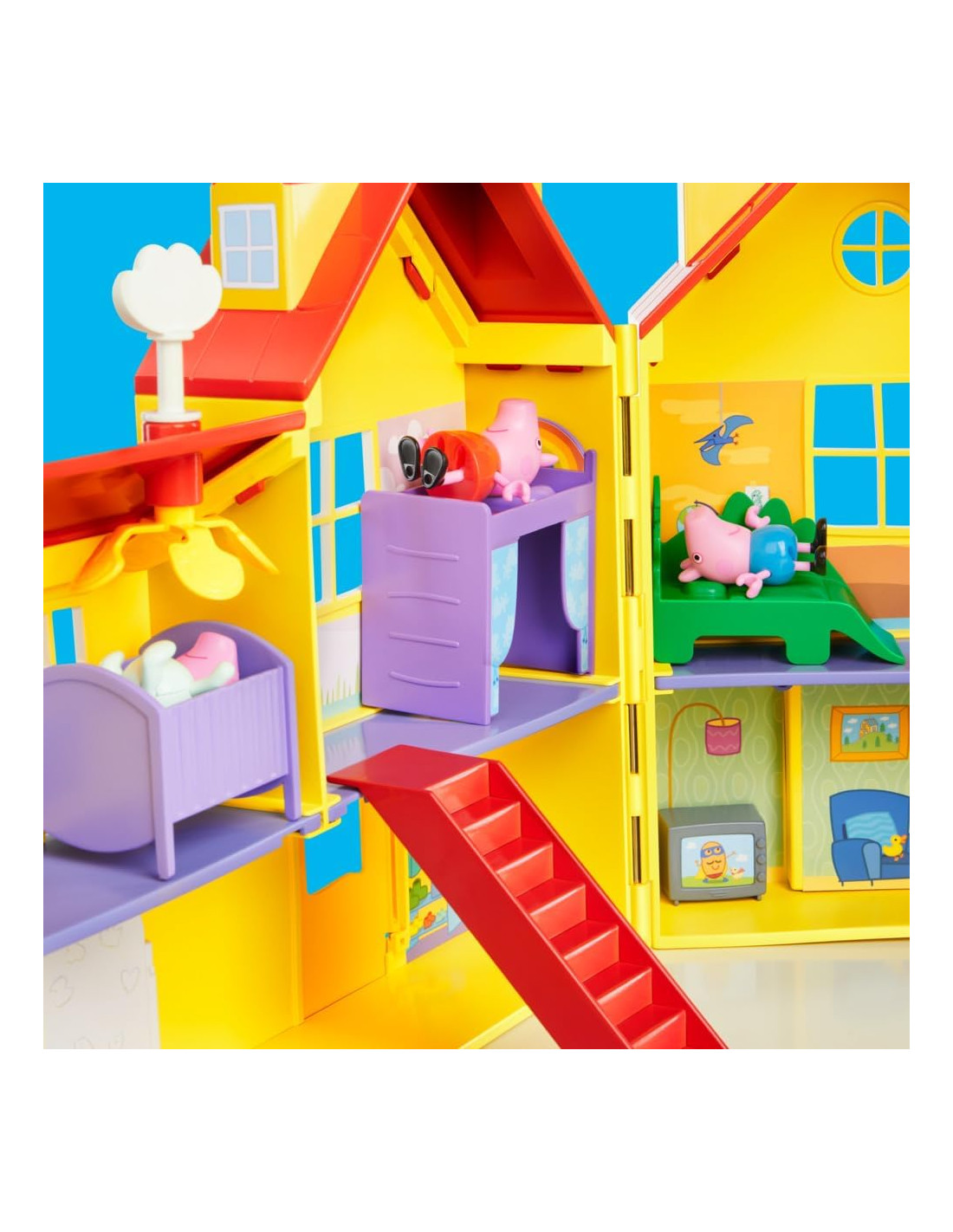 2 PIANI CON 7 STANZE DA SCOPRIRE: Peppa, George ed Evie hanno la propria stanza, proprio come nella serie; Ci sono il bagno, la sala, la cucina con il frigo che si apre e il garage con la porta sollevabile