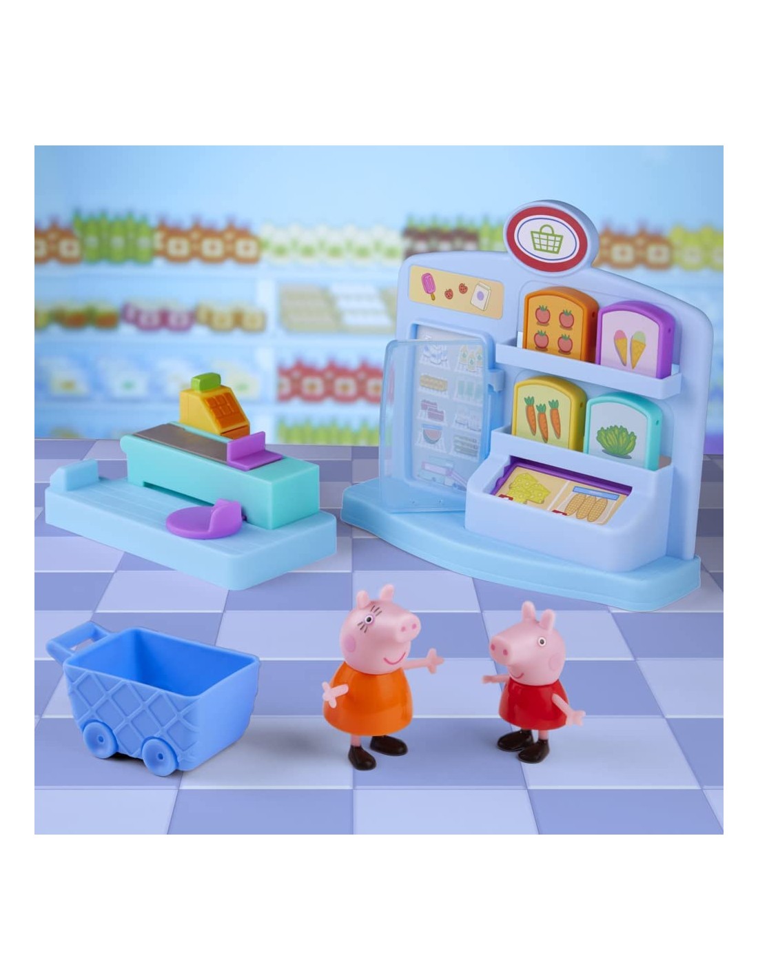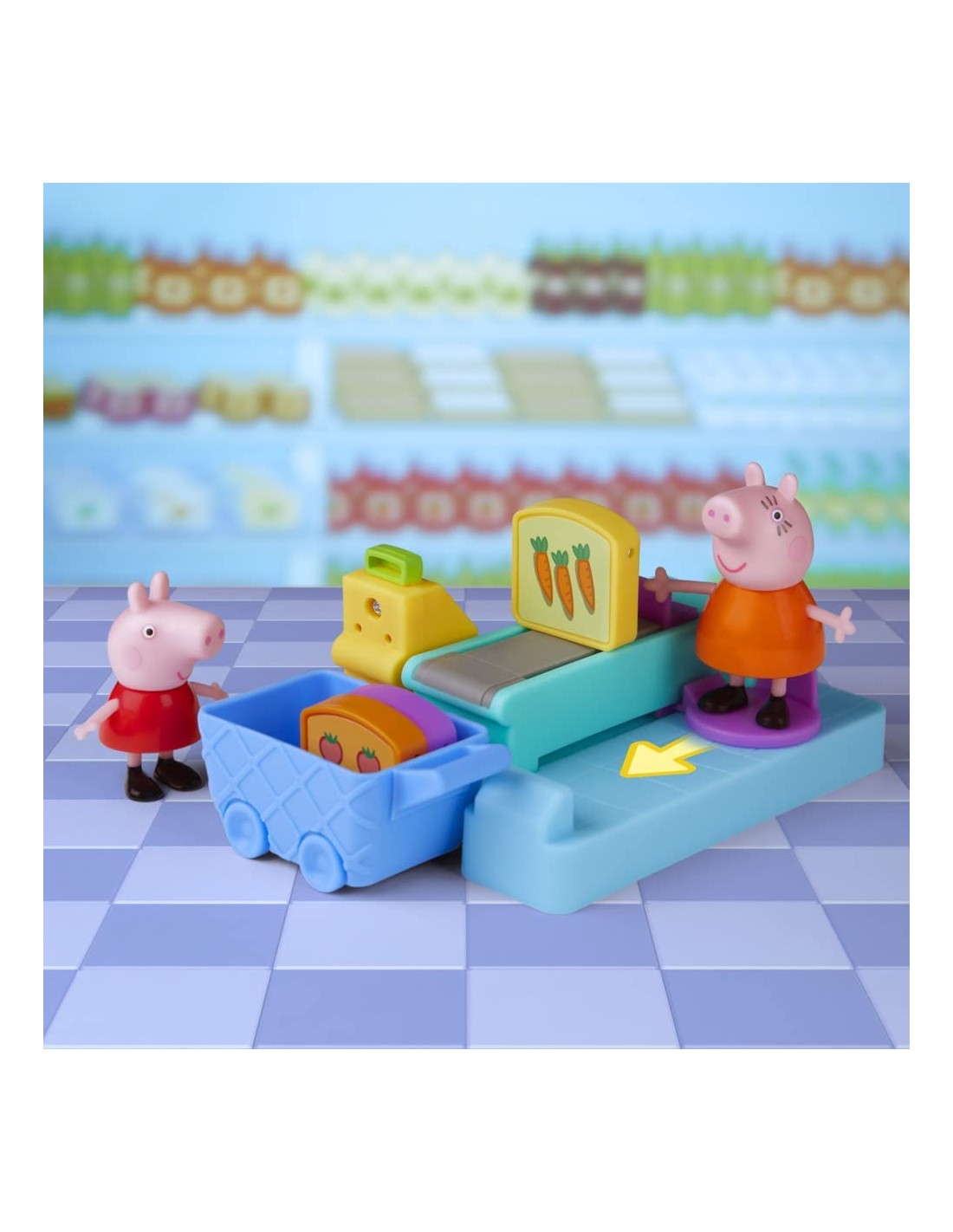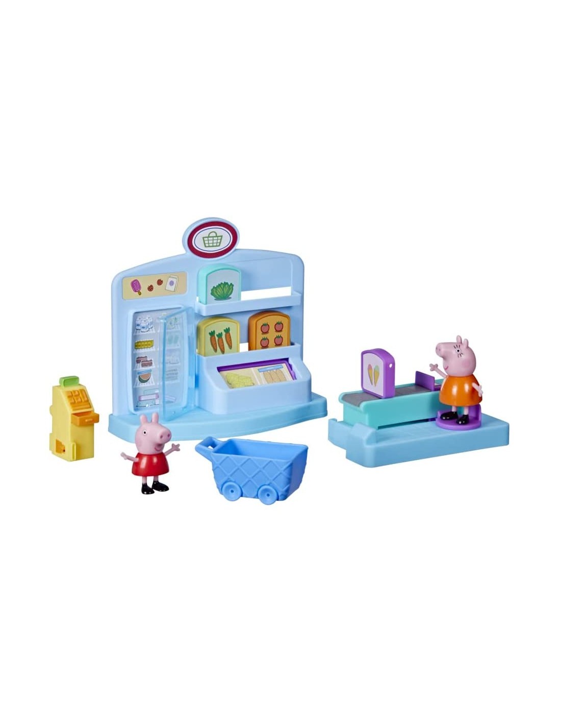 ANDIAMO A FARE LA SPESA CON PEPPA PIG: con il playset giocattolo per età prescolare Peppa al Supermercato, i piccoli maialini possono far finta di fare la spesa insieme a Peppa Pig e Mamma Pig. È il momento di riempire il carrello SFONDO COLORATO A TEMA NEGOZIO: presenta 4 accessori a tema cibo che possono essere inseriti nel carrello, oltre a un frigorifero integrato che si può aprire e chiudere. Include anche le action figure di Peppa Pig e Mamma Pig AREA CASSA DIVERTENTE: posiziona la spesa sul bancone e un'action figure sul punto di attivazione. Spingi il personaggio in avanti per vedere la spesa muoversi in avanti e la cassa aprirsi UN FANTASTICO REGALO PER BAMBINI IN ETÀ PRESCOLARE CHE ADORANO PEPPA PIG dai 3 anni in su. Ideale per festività, compleanni e qualsiasi altra occasione CERCA GLI ALTRI PLAYSET HASBRO PEPPA PIG, come il set Peppa all'acquario (venduto separatamente, secondo disponibilità)
