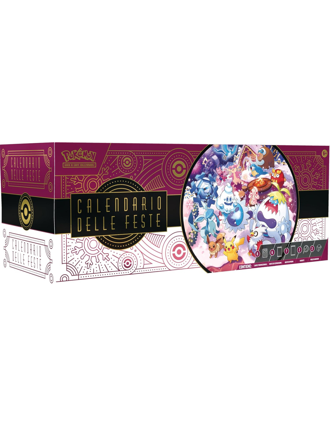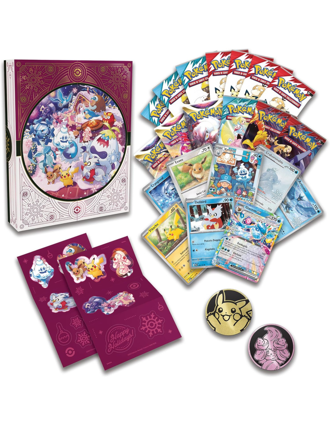 Inizia il conto alla rovescia per le festività con il calendario delle feste del GCC Pokémon. Dietro le 25 caselle si celano tante sorprese targate Pokémon, tra cui otto carte olografiche del GCC Pokémon con un logo a tema festivo. Puoi trovare Pokémon gettonati come Glaceon-ex, Vanillish e Crabominable! Festeggia con sei buste di espansione del GCC Pokémon assortite (ogni busta di espansione del GCC Pokémon contiene 10 carte e un'Energia base o un segnalino V ASTRO). Il calendario include anche sette buste di prova del GCC Pokémon, ognuna contenente tre carte. Ti attendono inoltre due monete Pokémon con Pikachu e Vanillish e due fogli di adesivi con vari Pokémon a tema festivo. In più, ti aspetta una carta codice del GCC Pokémon Live!