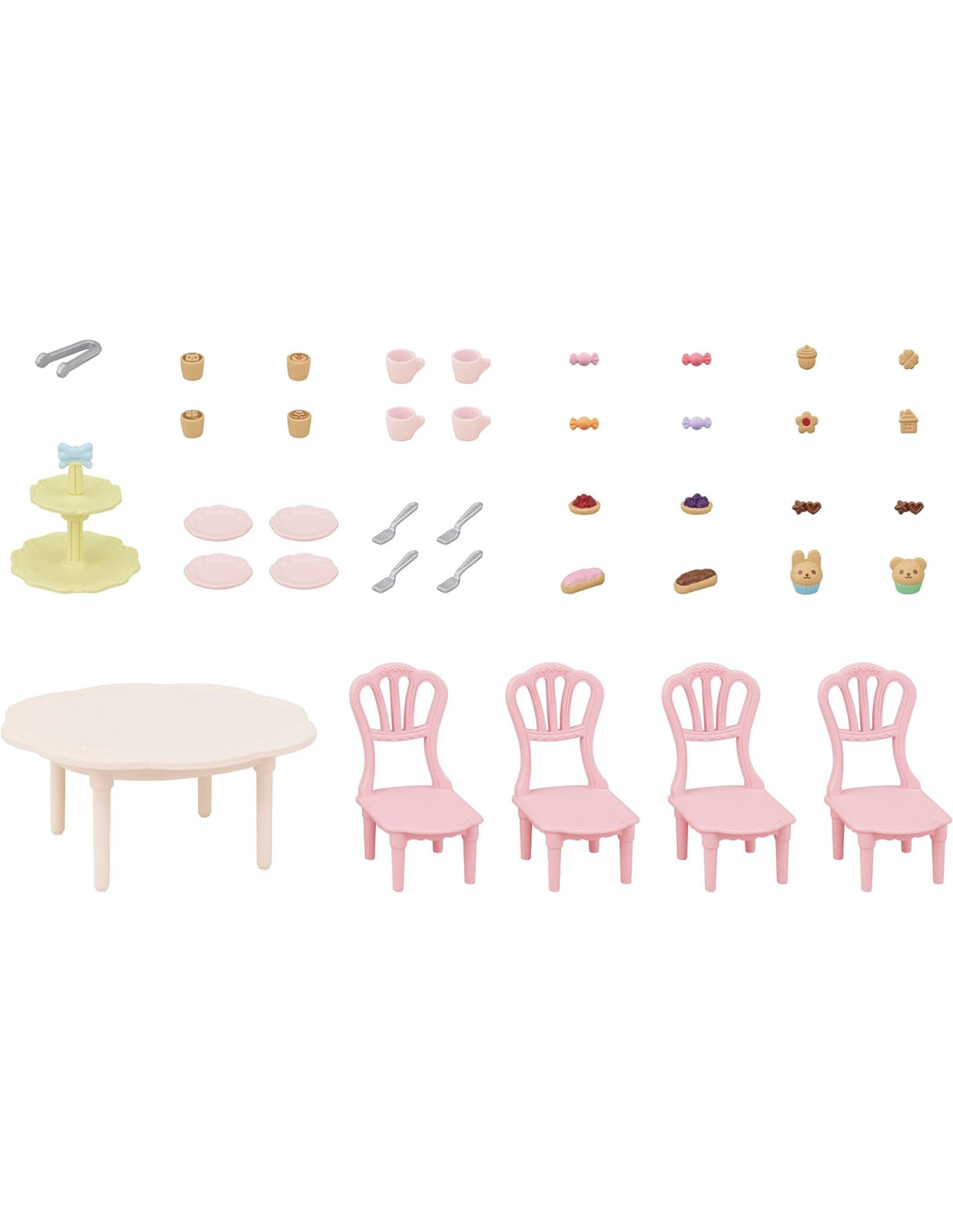 Set di mobili con tavolo e sedie colorate, caffè, torte ed altri dolcetti Contiene un totale di 30 accessori per l'ora del tè. Include una selezione di dolci e quattro diversi tipi di latte art. Stimola il gioco di ruolo fantasioso per i bambini. Adatto a partire dai tre anni in su.