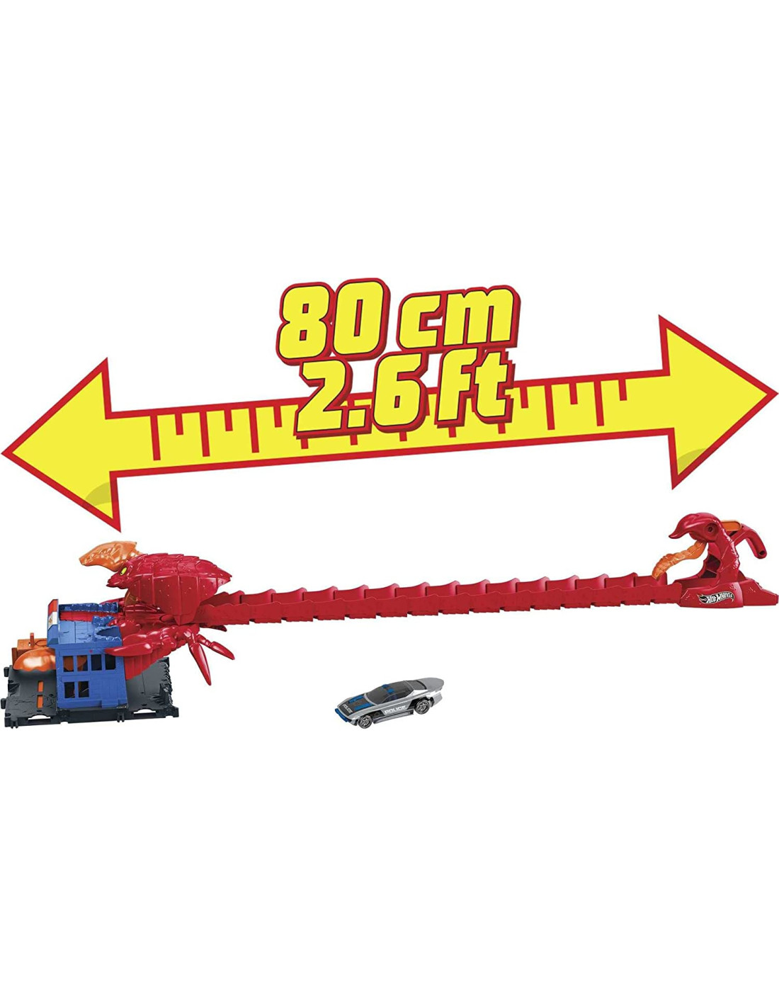 Uno famelico scorpione ha attaccato la stazione di polizia e i bambini possono usare la sua coda lunga 76 cm per un'avventura adrenalinica con fuga spettacolare! Lancia le auto nel vuoto dalla punta della coda dello scorpione e scegli una delle due vie di fuga per far sfrecciare le macchinine attraverso la stazione di polizia, lontano dagli artigli di Sven. Grazie ai diversi punti di raccordo, i bambini possono collegare questa pista ad altri playset, creando un paesaggio urbano pieno di creature per rendere le storie che inventaranno super entusiasmanti; vorranno collezionarli tutti (ognuno in vendita separatamente). Hot Wheels City Attacco dello Scorpione Mobile, include 1 veicolo Hot Wheels pronto a sfidare Sven lo Scorpione. È un regalo fantastico per i bambini dai 4 agli 8 anni e i collezionisti di qualunque età che amano l'adrenalina e l'avventura con Hot Wheels.