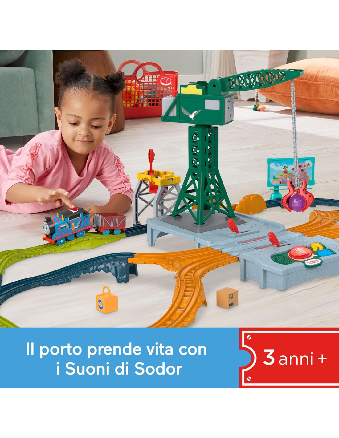 Il Porto di Brendam prende vita in un'esperienza di gioco entusiasmante con Il Trenino Thomas I Suoni di Sodor Cranky Delivery di Fisher-Price. Con 3 personaggi della serie, tra cui Cranky la Gru, una locomotiva Thomas motorizzata e Vagone Combina Guai, questo fantastico set con trenini e pista dispone di oltre 60 suoni e melodie per rendere la narrazione ancora piu' coinvolgente. Il set include una pista lunga 4,4 m circa, una postazione di carico azionata dai bambini e 3 pezzi di carico per divertirsi a caricare e scaricare. Il Porto di Brendam prende vita con questo trenino motorizzato e pista Il Trenino Thomas con oltre 60 melodie musicali e suoni ferroviari. Include una locomotiva Thomas alimentata a pile con suoni e Vagone Combina Guai collegabile che sfreccia lungo il binario e consegna il carico in tutta Sodor. Cranky la Gru ruota a 360 gradi e dispone di suoni divertenti e di un artiglio funzionante per caricare e scaricare il carico. Include una pista lunga 4,4 m circa! Per un divertimento ancora piu' ricco, collega questo set alle altre piste della linea Il Trenino Thomas, escluse quelle in legno (piste aggiuntive in vendita Separatamente, secondo disponibilita'). Promuove la narrazione e il gioco di immaginazione per i bambini in eta' prescolare dai 3 anni in su.