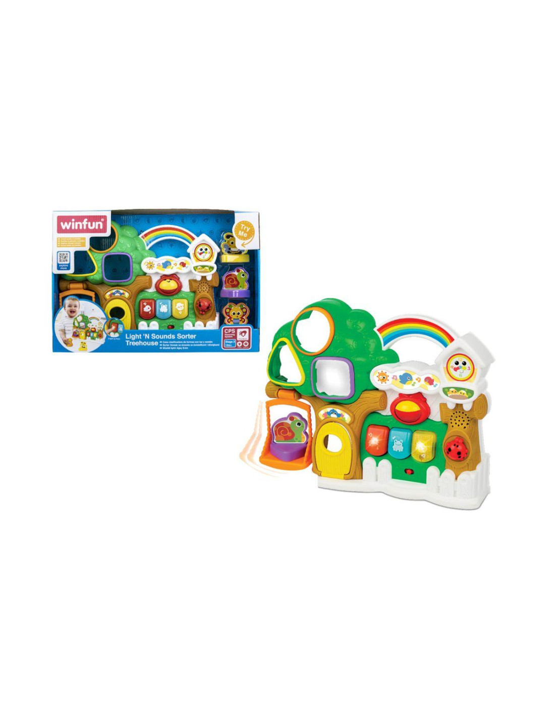 Centro attivita' Treehouse con 3 tasti luminosi: 2 modalita' di gioco: modalita' di riproduzione e modalita' musica. Introduce nomi di animali, suoni divertenti e allegre melodie. Peek-a-boo roller e coccinella che gira click-clack. Porta apribile e battente mobile. Manico arcobaleno per un divertimento da portare con se'.