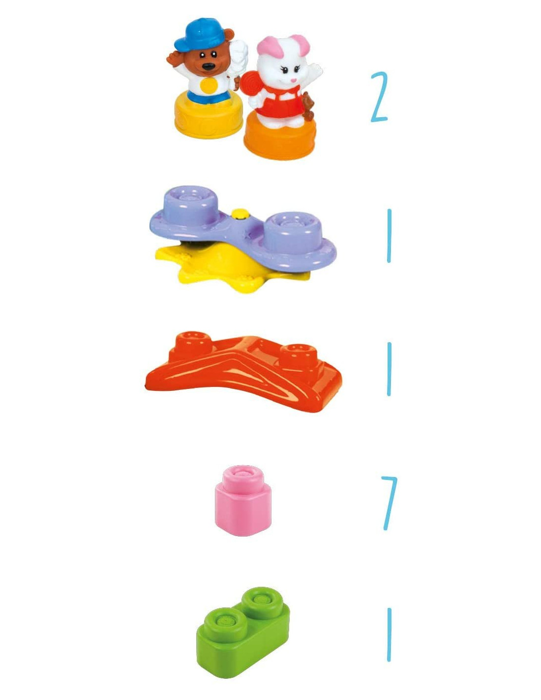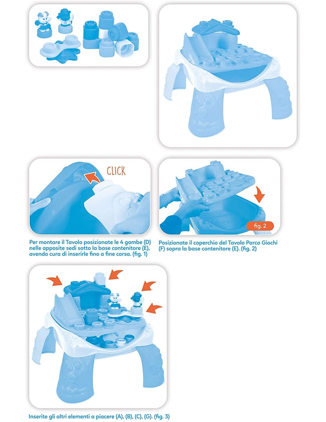 Un divertente tavolino da gioco che è un vero "parco divertimenti" grazie a tanti mattoncini Baby Clemmy a divertenti personaggi e agli accessori.