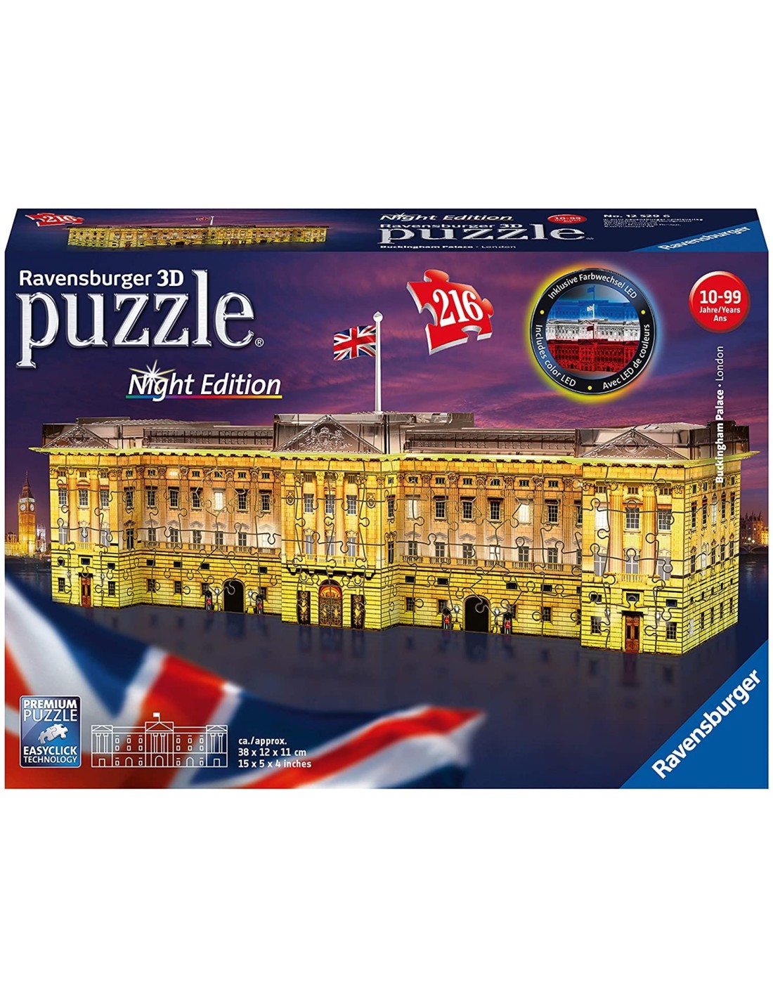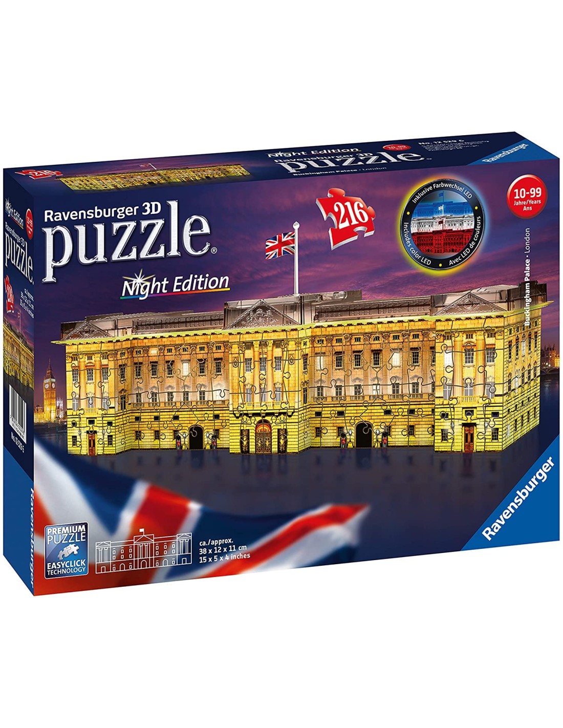 Il Buckingham Palace diventa un ottimo Puzzle 3D che si illumina. Grazie alla luce LED posizionata sulla base, la costruzione diventa di tantissimi e belli colori scintillanti. Puzzle 3D Building Ravensburger. Edifici ottimamente stabili realizzati con veri pezzi di puzzle. Pezzi in fibra plastica resistente di varie forme. Si assemblano senza l'uso di colla, forbici o altri utensili, sono ottimamente stabili e rappresentano fedelmente in ogni singolo pezzo tutti i dettagli del monumento. All'interno supporto per ambientazione. Accessori per rendere ottima e completa la tua costruzione. 216 pezzi di puro divertimento Ravensburger. Alimentazione tramite 3 pile stilo da 1.5 Volt tipo AA-LR6-UM3 non incluse nella confezione. Dimensioni scatola: 28 x 19 x 7 cm. Dimensioni puzzle: 35 x 11.5 x 11.5 cm. Contiene piccole parti che potrebbero essere ingerite. Pericolo di soffocamento