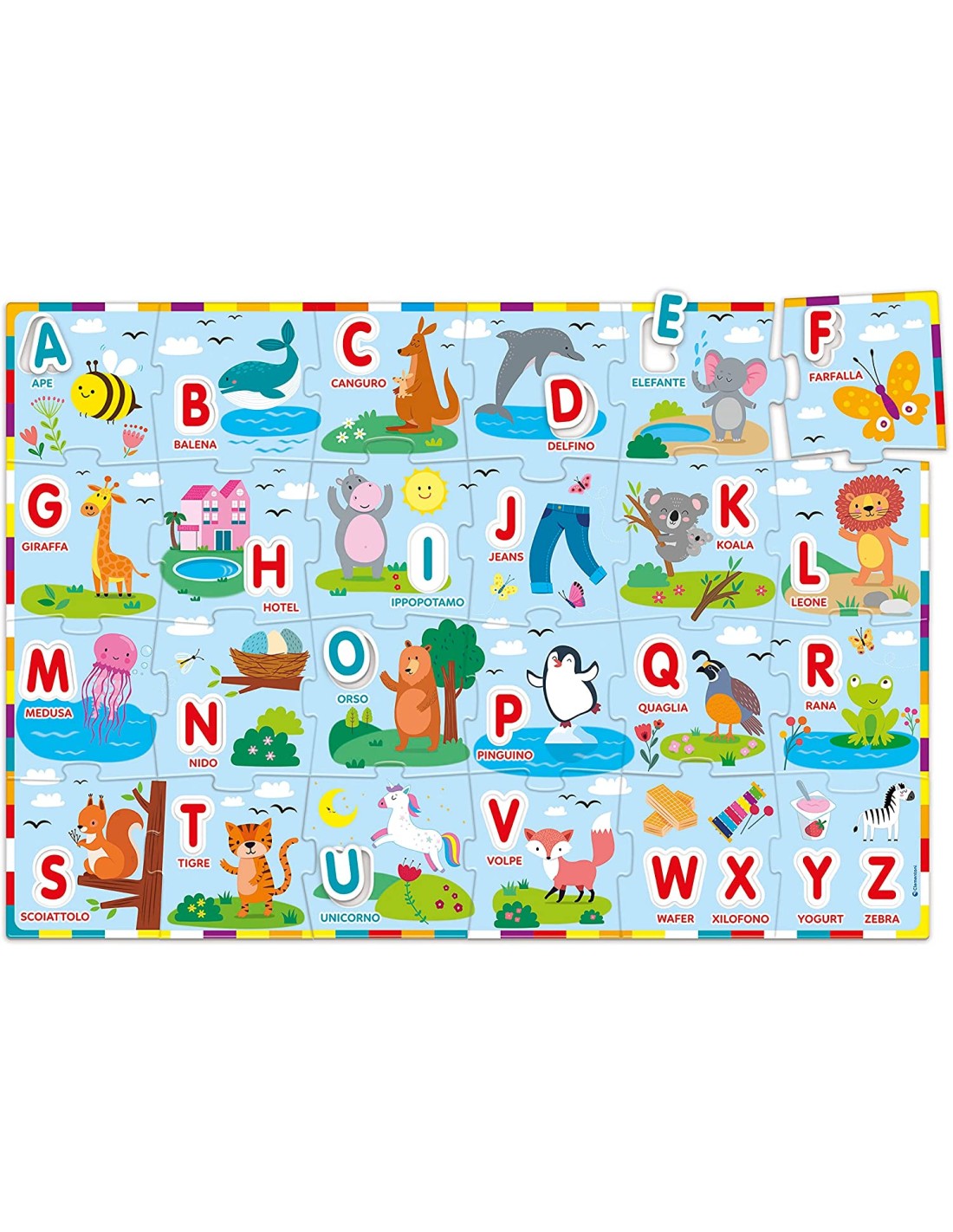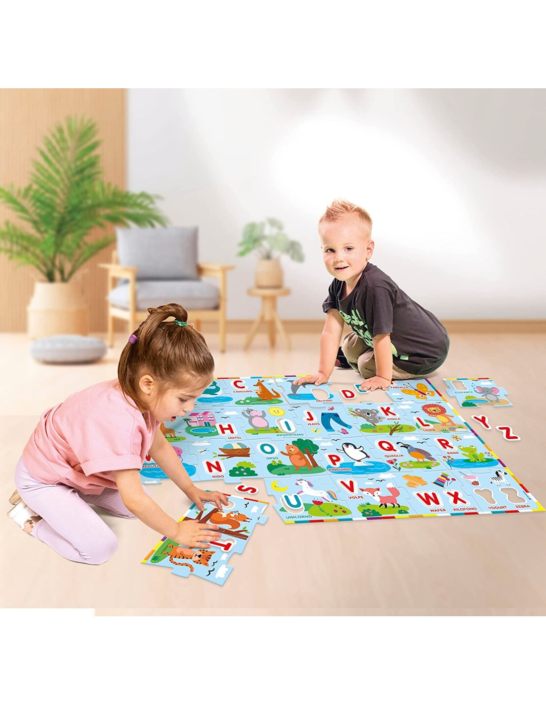 PUZZLE ALFABETO: Grande puzzle da pavimento a tema alfabeto con 24 maxi tessere e lettere sagomate da incastrare. Puzzle bambini completo: 100x70 cm SCOPO DEL GIOCO: Un gioco classico per avvicinare il bambino all'apprendimento delle lettere e delle prime parole CARATTERISTICHE: Gli incastri autocorrettivi allenano l'attenzione e permettono al bambino di giocare in totale autonomia GIOCO SOSTENIBILE: questo puzzle rientra tra i prodotti della linea Play for Future, fatti interamente con materiali riciclati GIOCO EDUCATIVO: un gioco Sapientino per bambini dai 3 anni. Made in Italy
