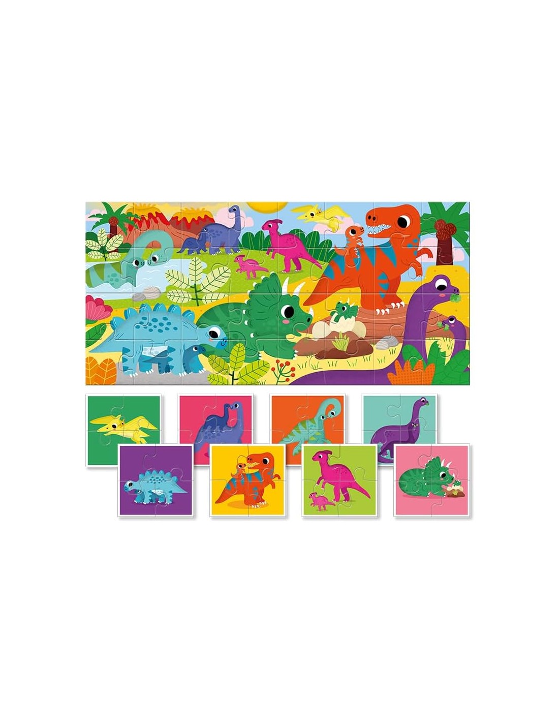 Un puzzle da ricomporre per creare un grande scenario da 32 pezzi. Sul retro, otto mini puzzle da 4 pezzi, pensati appositamente per i primi giochi di ricomposizione. Il gioco da incastro sviluppa la motricità fine, le abilità visuospaziali e la concentrazione.