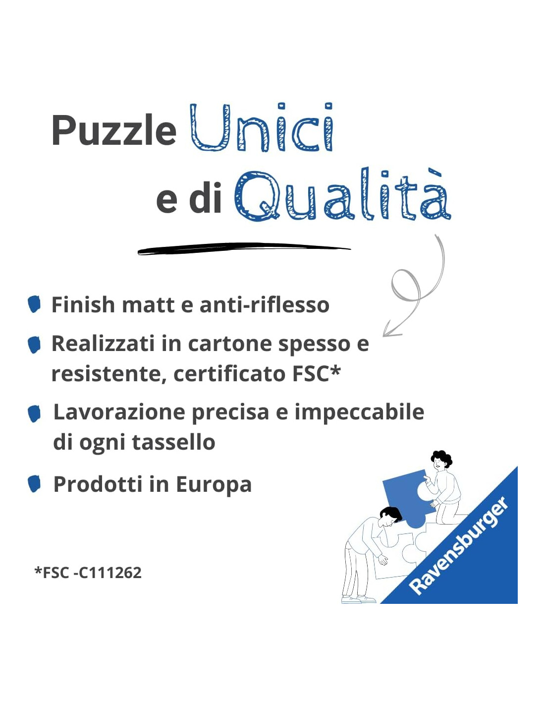 Questo puzzle è un passatempo educativo e stimolante per il tuo bambino: con i suoi 100 Pezzi XXL, è l'attività per stimolare curiosità e immaginazione dei bambini a partire dai 6 anni I Puzzle 100 pezzi XXL Ravensburger fanno parte di una linea interamente dedicata ai piccoli con immagini colorate e vivaci, con personaggi amati dai bambini per coinvolgerli nell'esperienza di gioco attraverso le loro illustrazioni preferite Qualità e sicurezza sono le nostre priorità: I Puzzle Ravensburger sono realizzati in cartone riciclato e tagliati con fustelle fatte a mano, per garantire un incastro sempre e un risultato I Puzzle Ravensburger stimolano la motricità fine, la coordinazione occhio-mano ed esercitano la concentrazione e la pazienza, insegnando ai piccoli a risolvere i problemi con un approccio strategico e strutturato Scopri le diverse collezioni dei Puzzle Ravensburger dedicati ai bambini di tutte le età: potrai scegliere tra tantissime immagini raffiguranti teneri cuccioli, mondi fantastici o gli eroi preferiti dai piccoli
