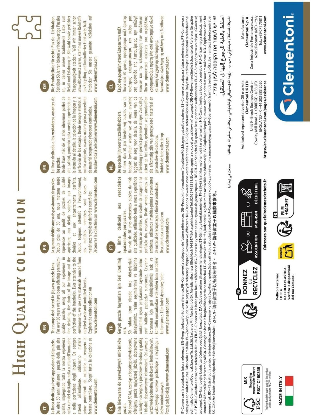Puzzle da 1000 pezzi per adulti Dimensioni del puzzle completato: 70 x 50 cm Le immagini più attraenti, la più grande varietà di dimensioni e la firma qualità Clementoni per una gamma che è un gold standard per gli amanti del puzzle ovunque Acutamente in sintonia con l'importanza della consapevolezza ambientale, Clementoni fa ampio uso di materiali riciclati ed evita qualsiasi componente contenente inquinanti Prodotto in Italia Visita la sezione di supporto di Clementoni per beneficiare del servizio "pezzi persi"