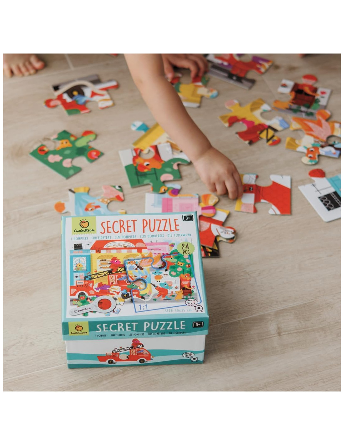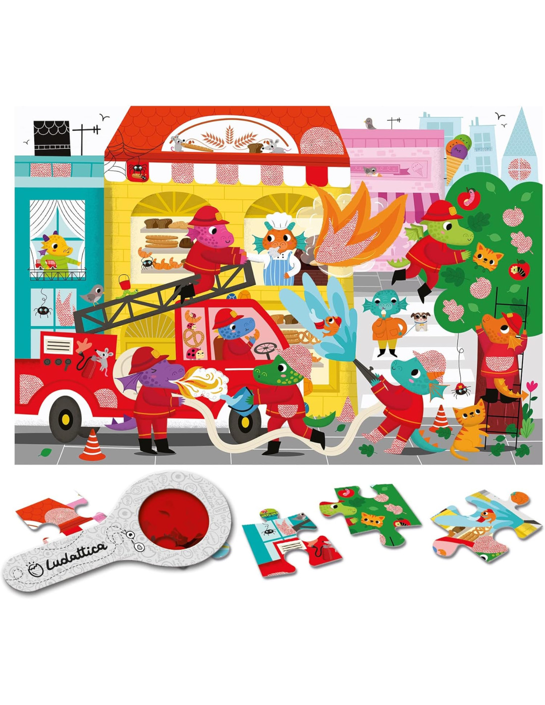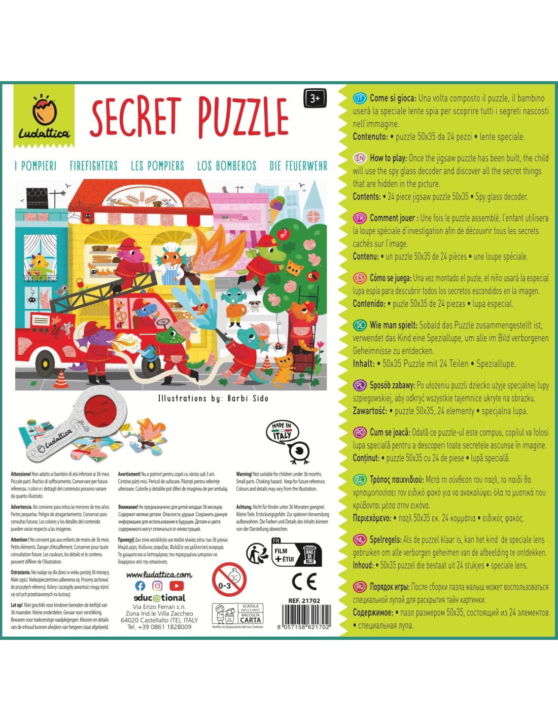 Due giochi in uno: Dopo aver completato il puzzle, i bambini potranno usare una lente 'magica' che permetterà di scoprire cosa si nasconde nelle zone segrete dell'illustrazione.
