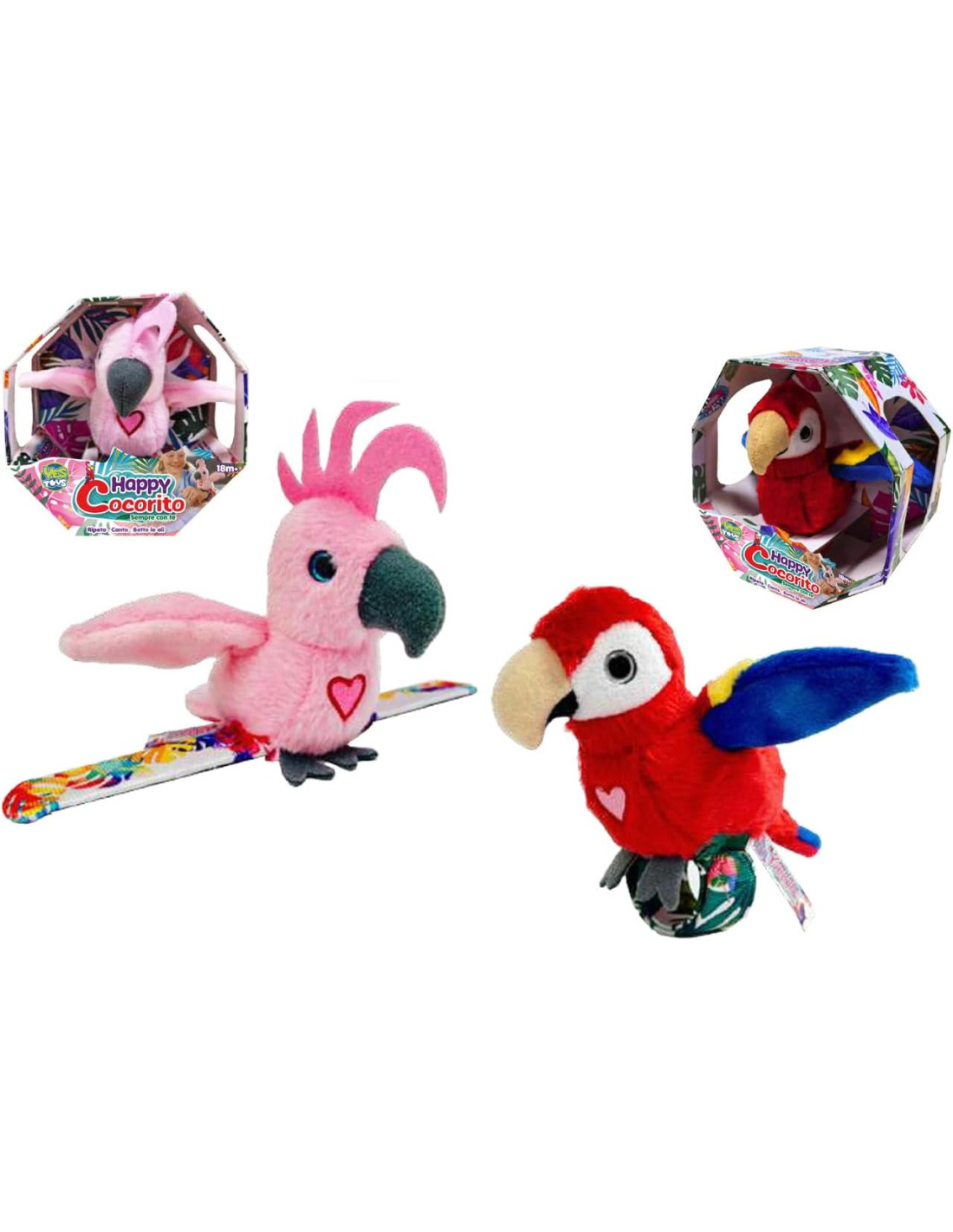 Vivi un divertimento interattivo come mai con Happy Cocorito Sempre con te! Questi graziosi uccelli di peluche ripetono parole e suoni pronunciati, cantano l'allegra canzone degli Happy Cocorito (Rockn' Robin) e sbattono le ali. Grazie alla lavorazione di alta qualità in morbido poliestere, sono il compagno di polso ideale per i bambini.