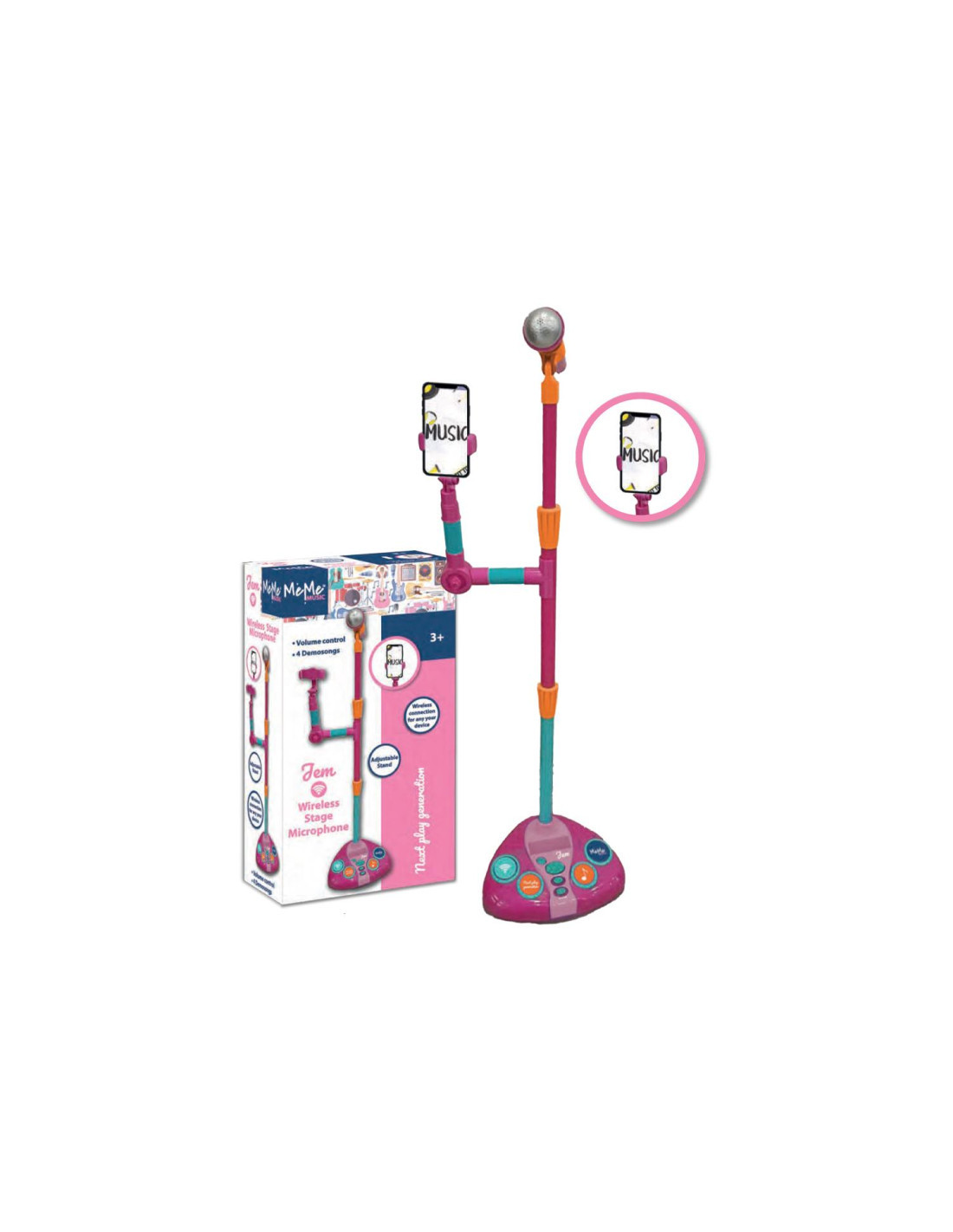 Microfono da palco wireless con 4 tracce demo. Pulsante di accensione/spegnimento. Controllo del volume. Supporto regolabile in altezza fino a 120cm. Posizione del microfono regolabile. Supporto universale per smartphone. Collegamento per una sorgente audio esterna. Batterie non incluse.