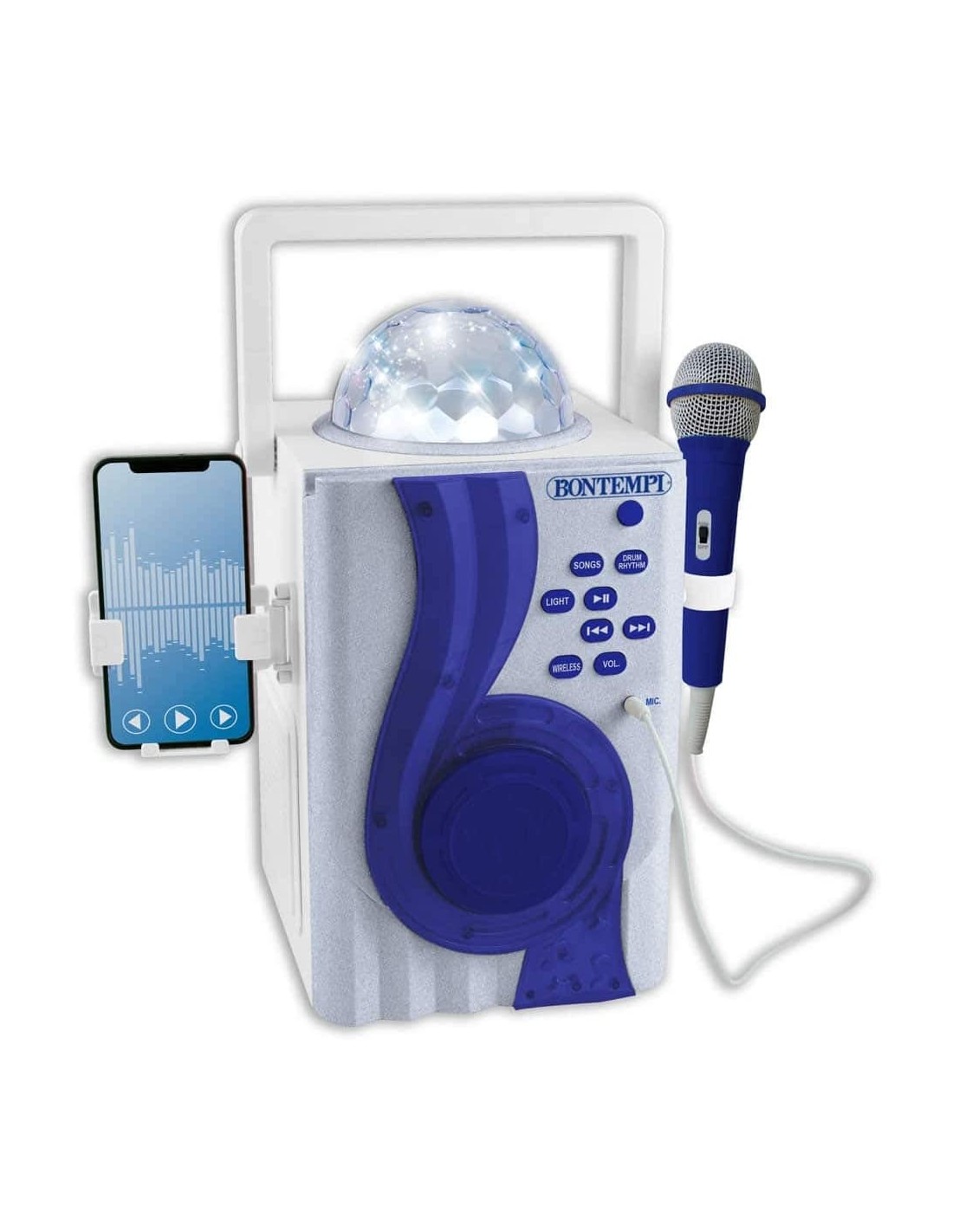 Caratteristiche: microfono con effetto eco, 70 brani preregistrati, 20 ritmi, effetti luminosi, regolazione volume, connessione wireless, controlli avanzamento brani Mp3, maniglia, presa per sorgente esterna, cavetto incluso, presa per microfono