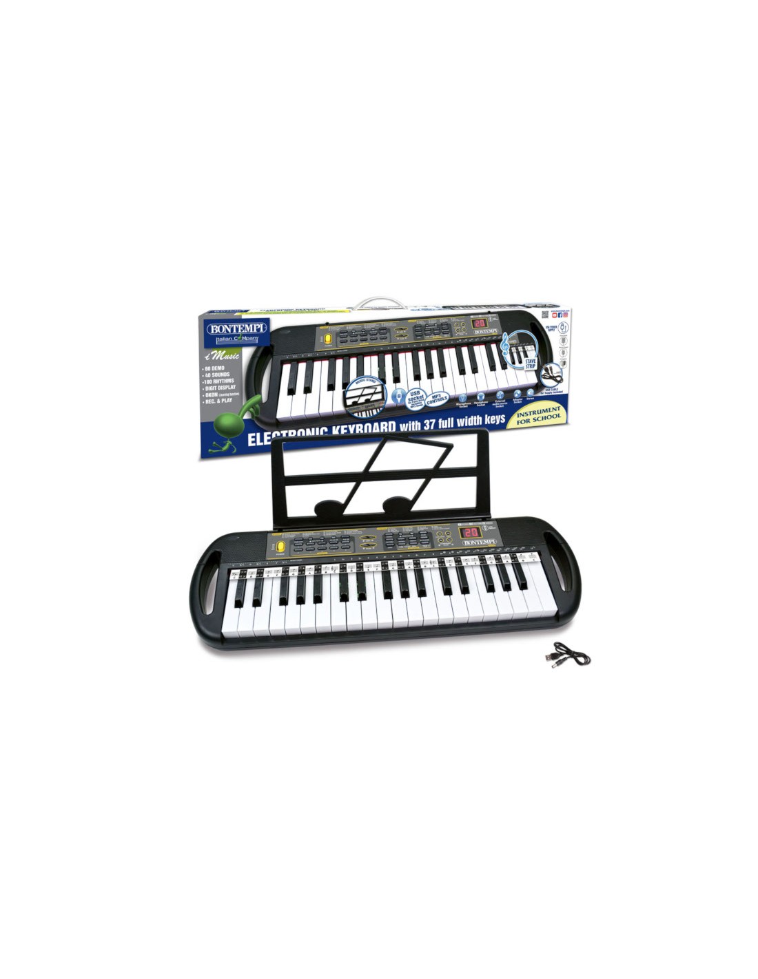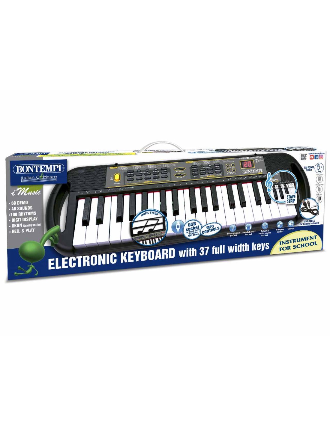 Tastiera digitale • 37 tasti passo medio (DO-DO) • 100 suoni • 100 Ritmi • 10 canzoni preregistrate • Polifonia 8 note • Demo One, Demo All • Funzione di registrazione e riascolto • Transposer: per cambiare la tonalità • Effetti: Vibrato, Sustain • Controlli: Volume generale, Start/Stop, Tempo +/– • Borsa di trasporto inclusa • Presa per adattatore da rete (non incluso) • Presa per cuffia • Spegnimento automatico • Alimentazione: con adattatore da rete (non fornito) o con cavetto USB-DC (fornito) da collegare ad una power bank, PC, caricatore telefonico ecc. (non forniti) o con 4 batterie da 1,5V tipo R6/AA (non fornite) • Striscia pentagramma (fornita) • Dim: 546x220x51 mm