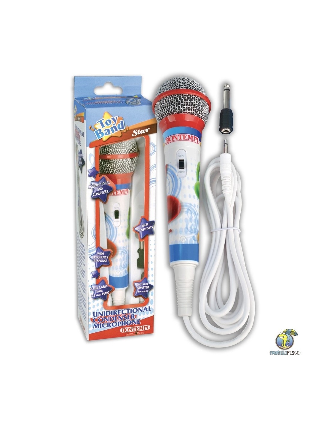 Microfono a condensatore, ideale per sessioni di registrazione audio e per karaoke il ambienti chiusi. Il prodotto non è un giocattolo, non adatto a bambini di età inferiore a 6 anni Contenuto della confezione 1 x microfono -Microfono a condensazione, utilizzabile con tutti i prodotti Bontempi -Ideale per registrazioni audio -Ottima riproduzione del suono Microfono a condensazione, utilizzabile con tutti i prodotti Bontempi Ideale per registrazioni audio
