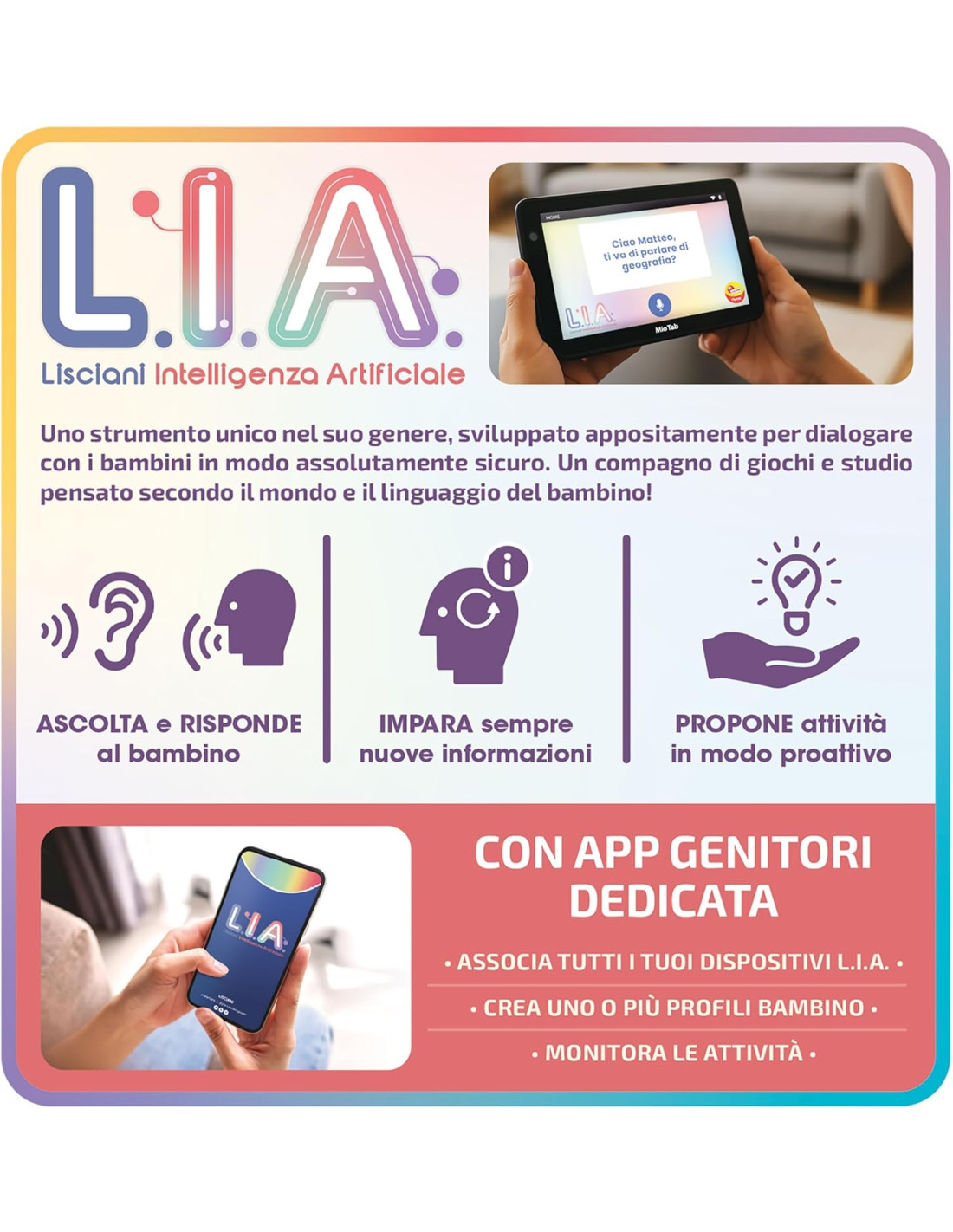 Con intelligenza artificiale Schermo da 7 pollici - Memoria Flash 32 GB - Ram 4 GB - Wi-Fi - Bluetooth - Google Play Store - Internet sicuro - Bumper protettivo con stender - Integrato con App d'Intelligenza Artificiale Tablet - Cavo USB type-C - Caricatore - Manuale istruzioni Autonomia - Capacità sensoriali - Coordinazione occhio mano - Lessico - Attenzione e concentrazione - Apprendimento - Sviluppo del linguaggio