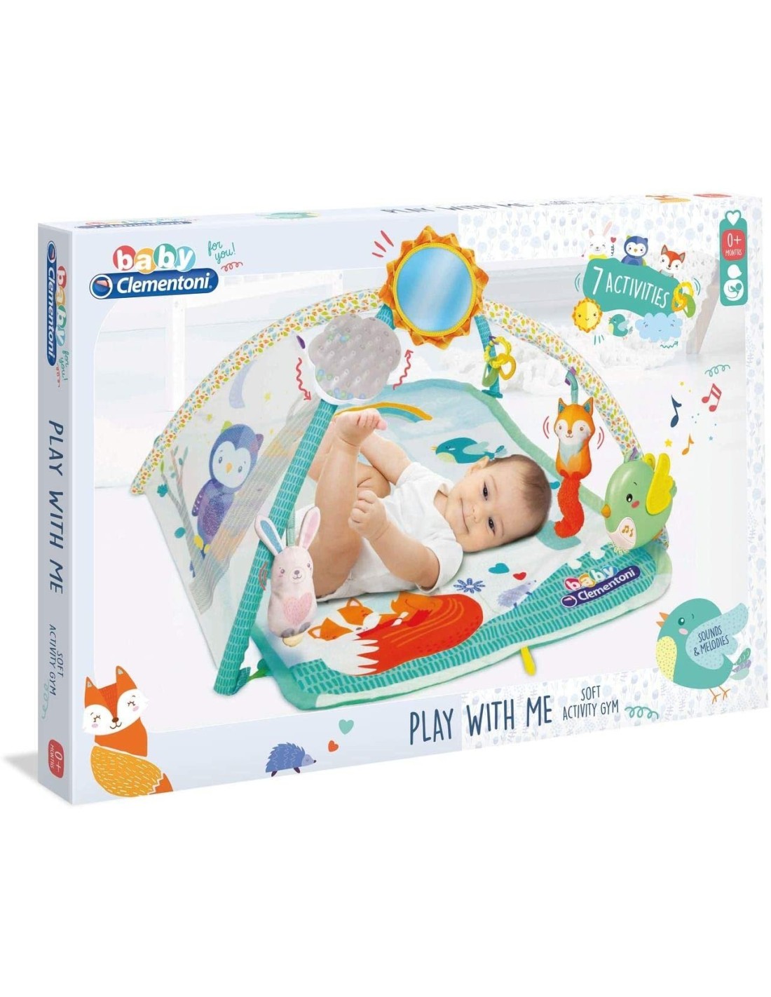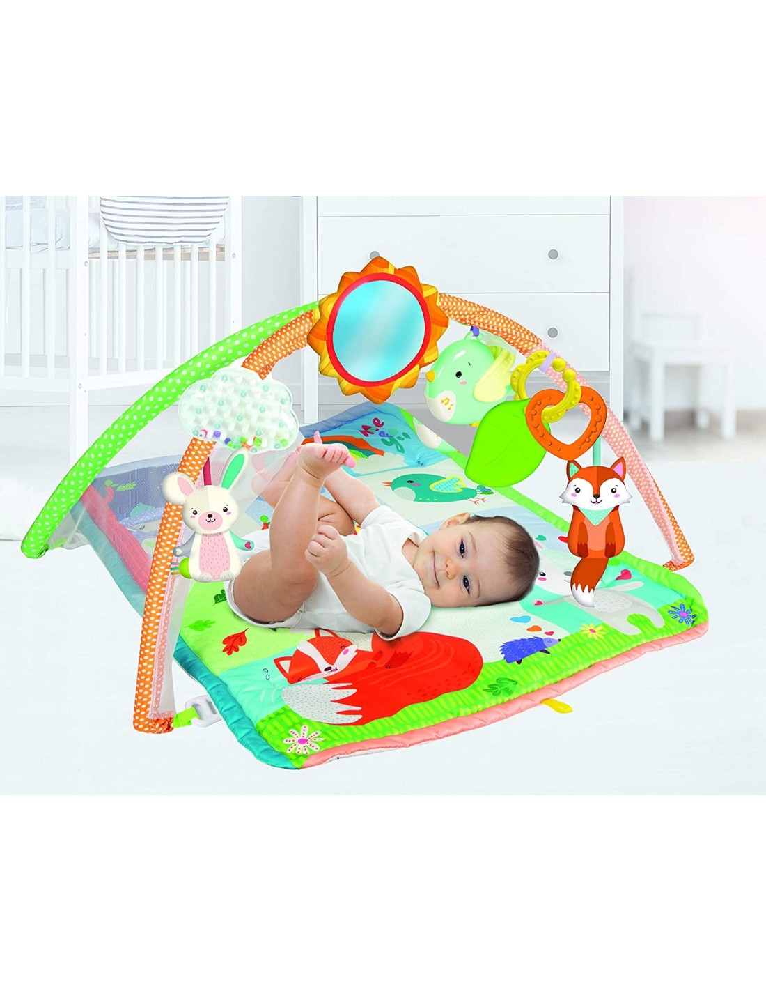 Una colorata Palestrina con tante attività che il bambino può svolgere con i genitori o in autonomia. Con morbidi pendenti in plastica e stoffa che aiutano a sviluppare le capacità manuali, visive ed uditive del bambino. L'uccellino riproduce rumori bianchi e musiche sviluppate appositamente per portare benessere al bambino. La morbida coda della volpe è perfetta per giocare al solletico, mentre lo squeak nel pancino del coniglietto invita al gioco dei bacini. Il sole è uno specchietto per stimolare il riso ed il riconoscimento di se stessi, la retina con il gufetto invita al gioco del cucù. La nuvola è un sonaglino che simula il rumore della pioggia, mentre i pendenti morbidi sono perfetti per la fase della dentizione.