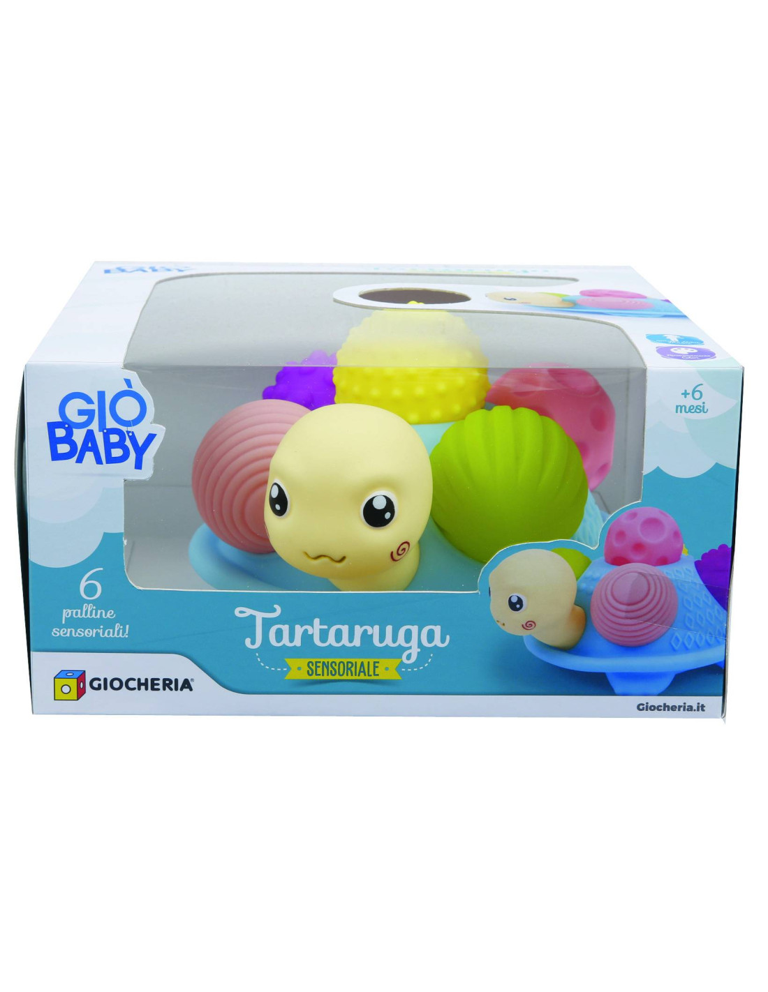 Una simpatica tartaruga con 6 palline sensoriali con varie texture. Ideale per lo sviluppo delle abilità motorie del bambino.