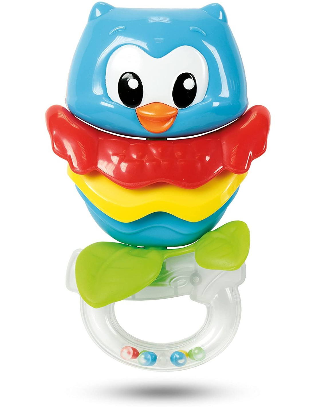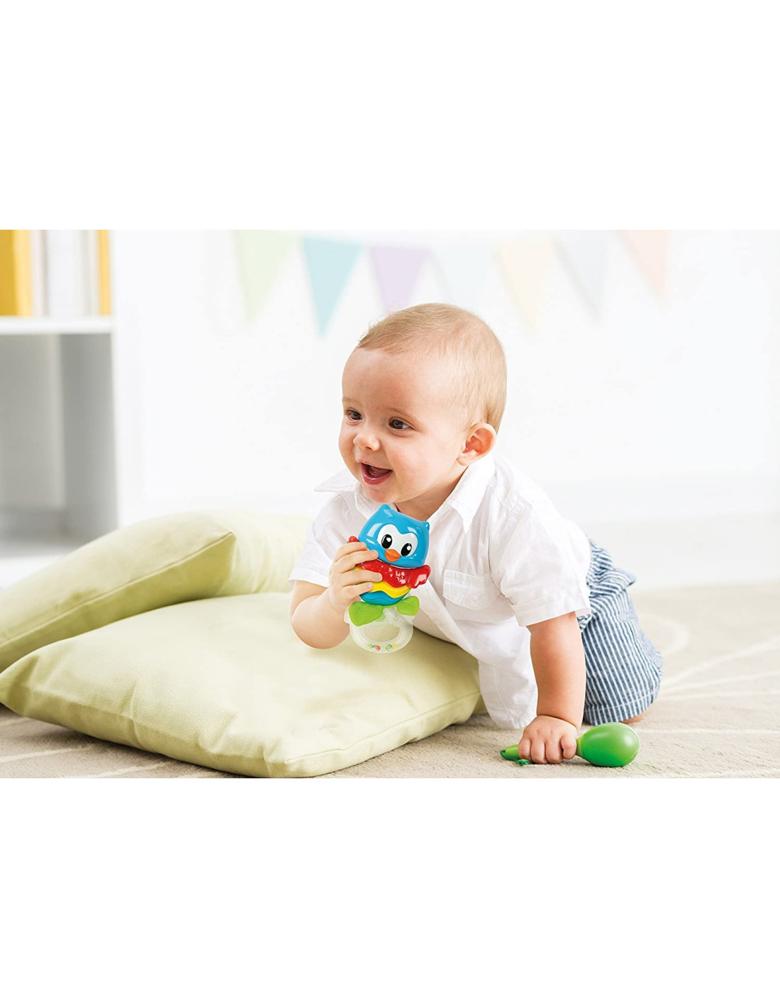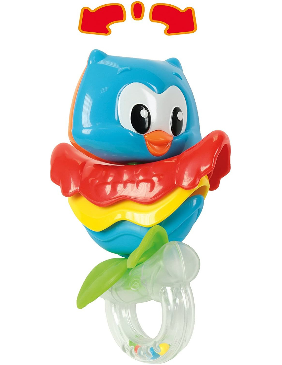 Le ali colorate fungono da maniglia, l'aletta azzurra si muove avanti e indietro e le simpatiche palline nel pancino stimolano la percezione visivo-uditiva e la manualità del bambino. Il pendente in morbida plastica, tutto da mordicchiare, è ideale per la fase della dentizione.