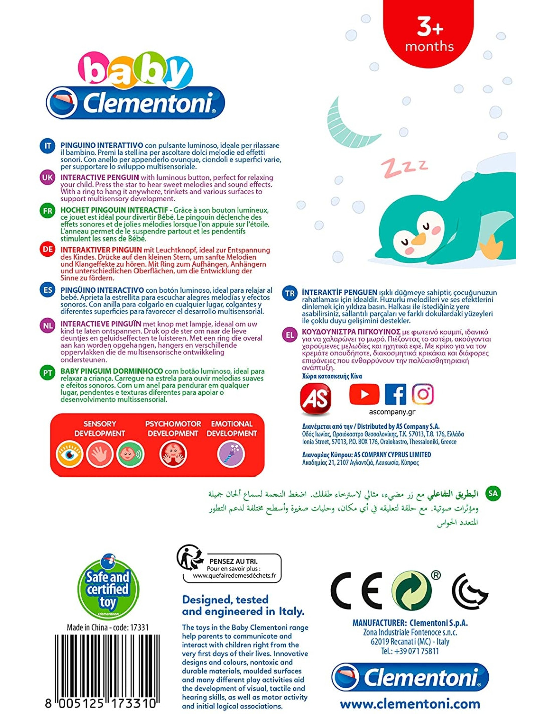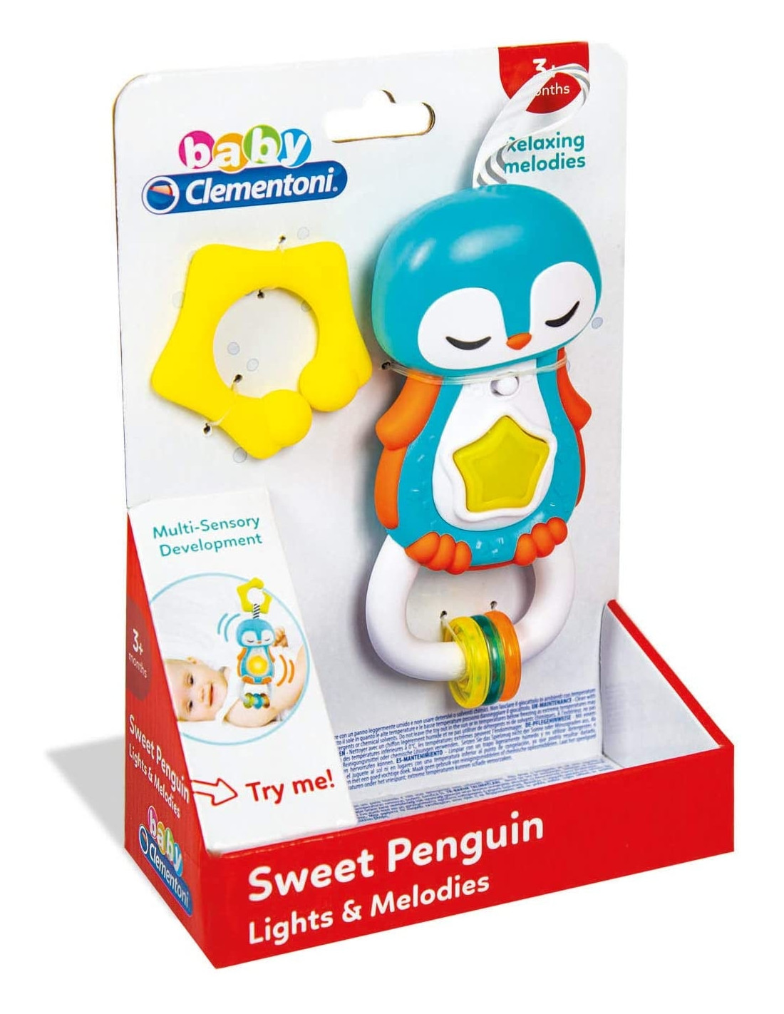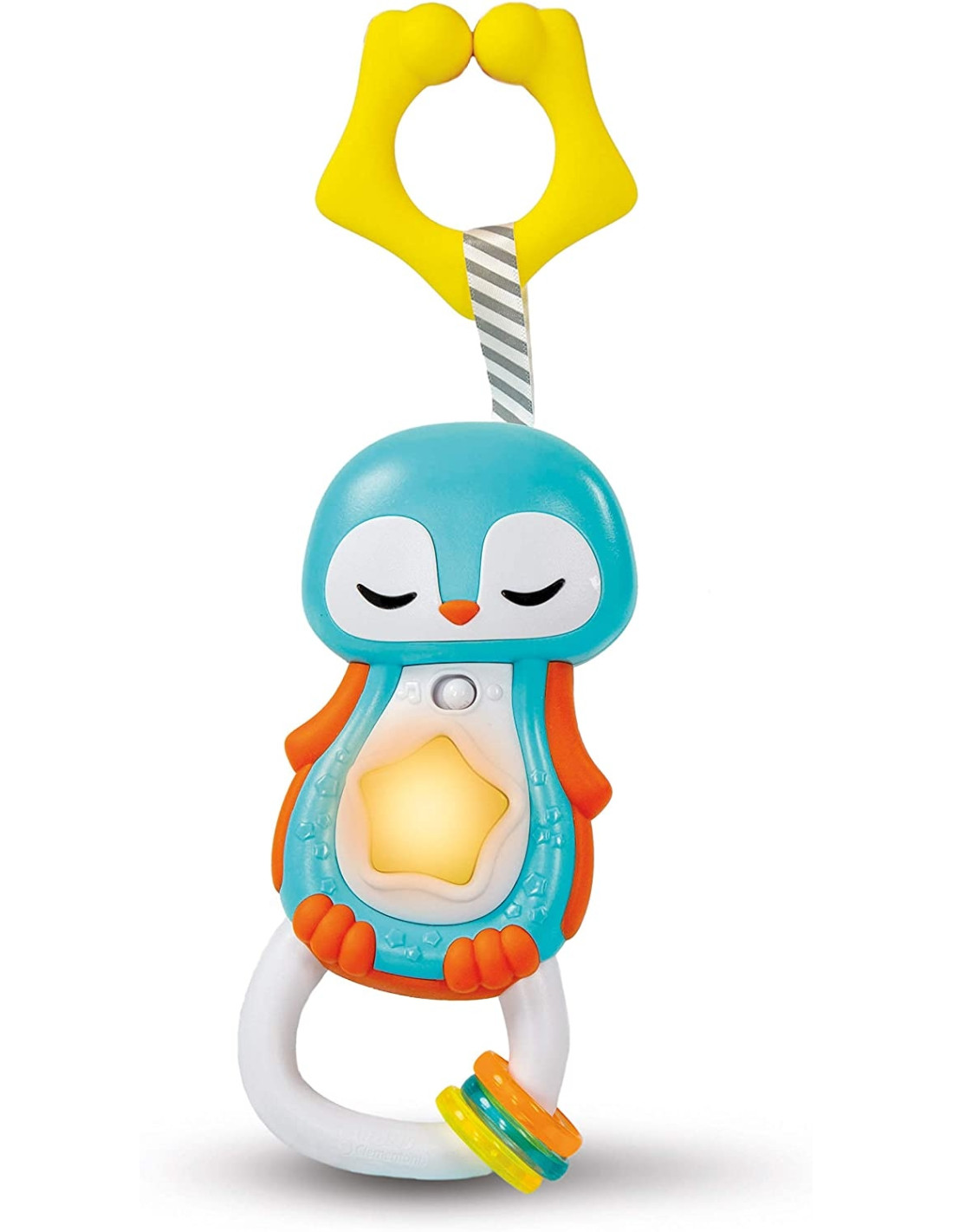 Scuotendo il sonaglino i ciondoli creano un simpatico effetto sonoro e il pratico anello è perfetto per agganciare il pinguino alla culla o al passeggino