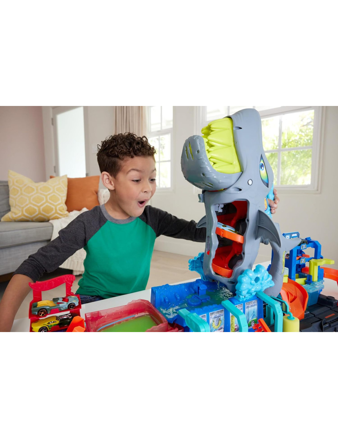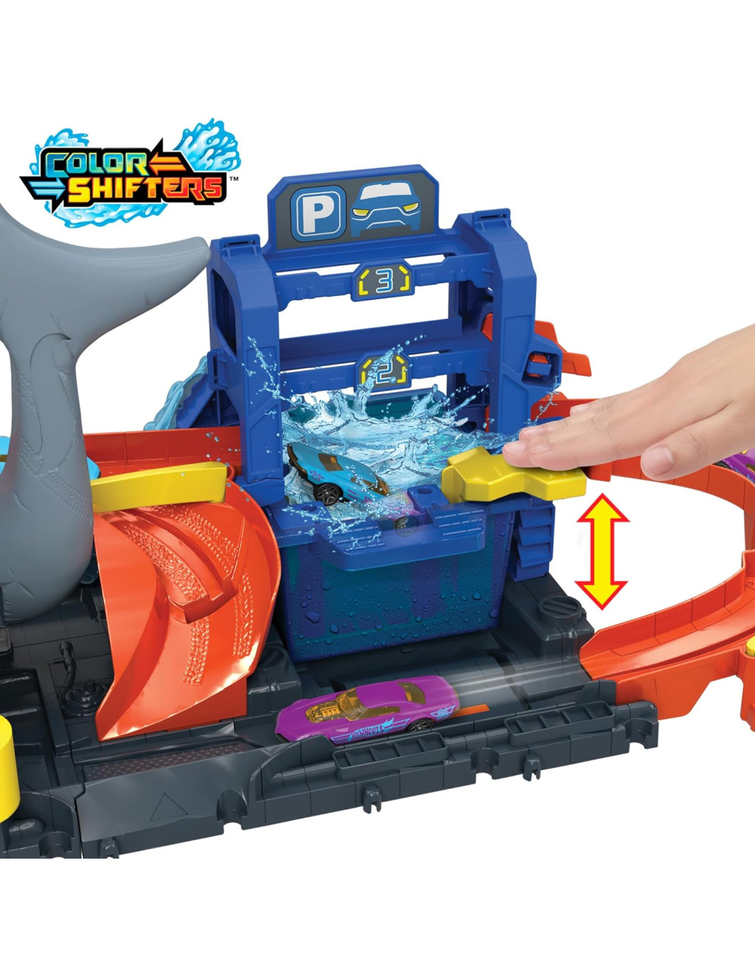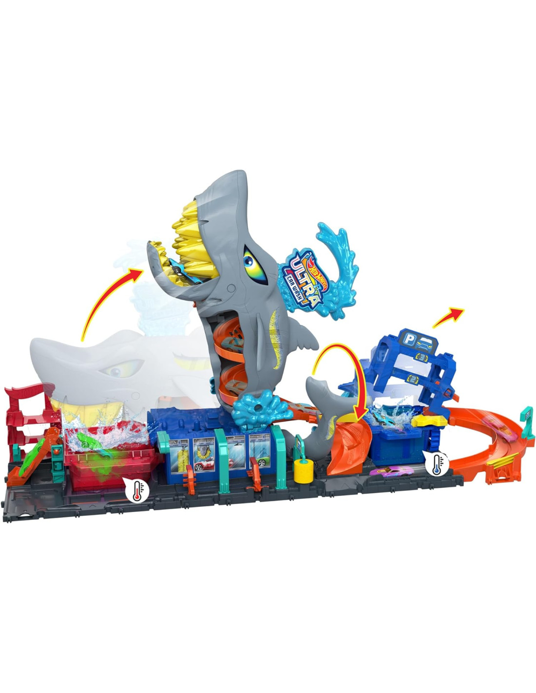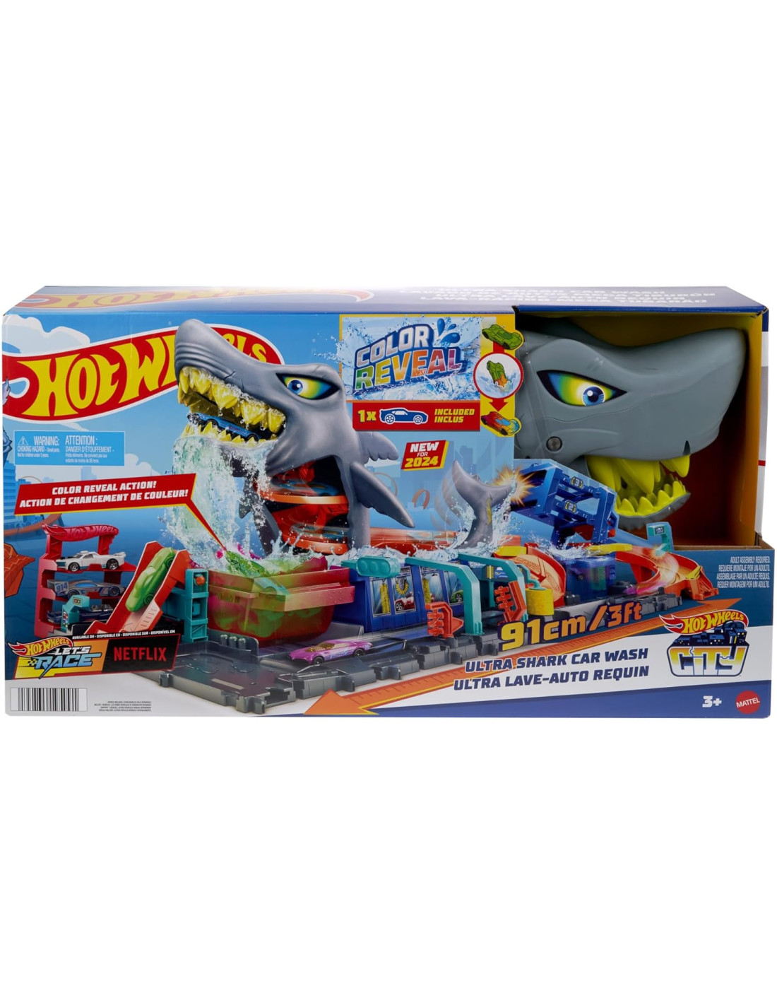 L'autolavaggio di Hot Wheels City e' stato occupato da un enorme squalo che sta cercando di tuffarsi in un'azione che cambia colore! I bambini guidano il veicolo Color Reveal incluso sulla rampa e nella bocca dello squalo, quindi premi la testa dello squalo per cambiare il colore dell'acqua e rivelare la decorazione dell'auto. Sali sullo squalo e guarda l'auto sfrecciare all'interno mentre l'acqua in eccesso viene scaricata. Tocca la coda dello squalo per lanciare le auto dal parcheggio o nel serbatoio dell'acqua ghiacciata per una sorpresa che cambia colore. Cambia di nuovo i colori dell'auto eseguendo nuovamente il lavaggio. Il gioco dettagliato dei binari sulla base migliora la narrazione con cancelli mobili e un rullo di schiuma che e' proprio come un vero autolavaggio. Il set si piega a meta' per riporlo facilmente e include una maniglia per aiutarlo a trasportarlo e drenare l'acqua in eccesso. e' incluso un veicolo Hot Wheels Color Reveal. Immergiti nell'autolavaggio Hot Wheels City Ultra Shark per un gioco interattivo che cambia colore in una delle location presenti nella serie Netflix "Let's Race!".