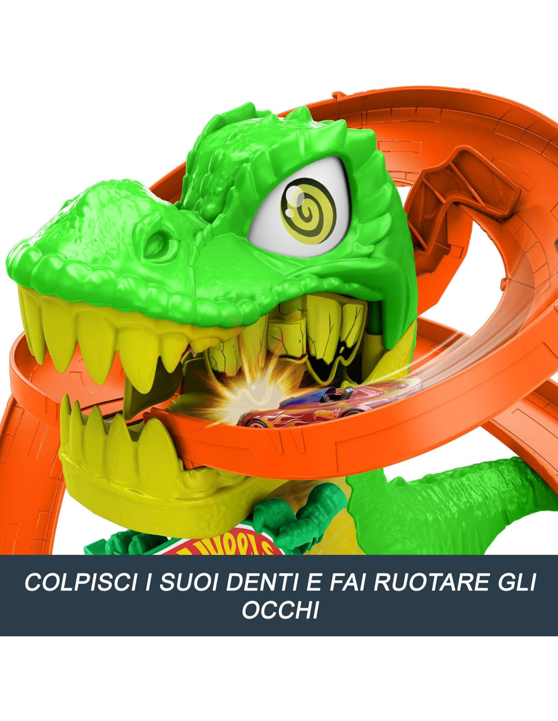 Il playset include un grande dinosauro con occhi che ruotano ogni volta che le macchinine gli passano davanti, fino a quando non viene sconfitto!