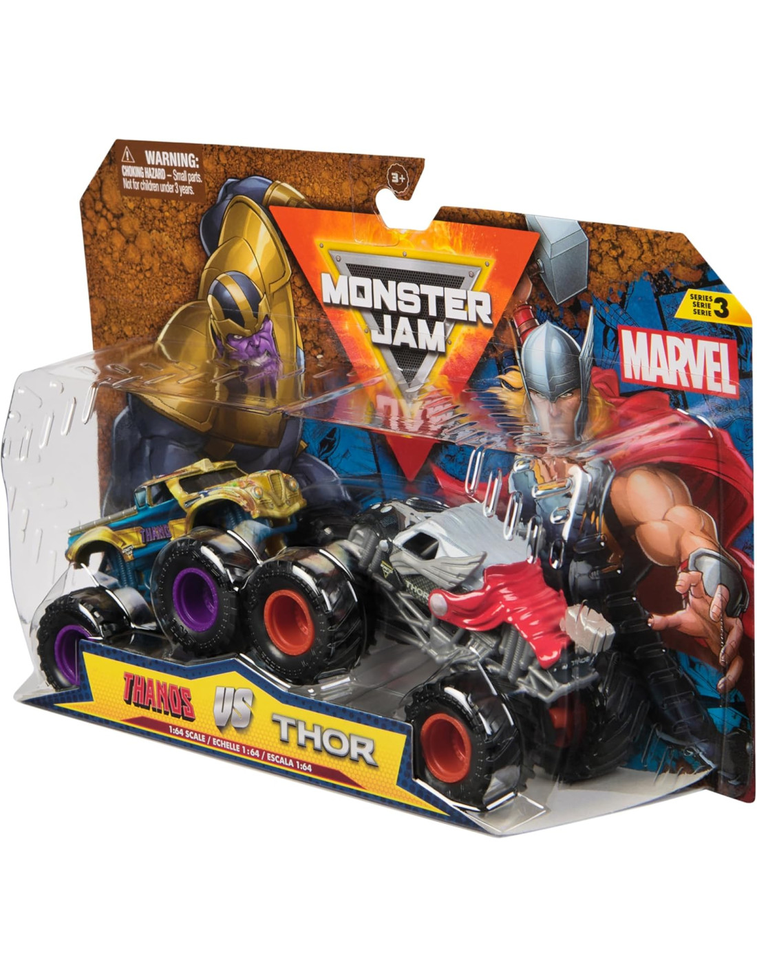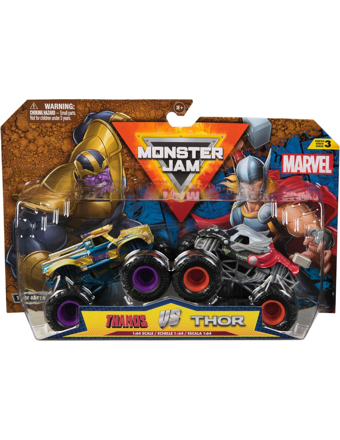 2 MARVEL MONSTER JAM TRUCKS: porta le battaglie della Marvel nell'arena Monster Jam con la confezione da 2 pezzi in scala 1:64 Thanos vs Thor: gli incontri finali pronti a scontrarsi
