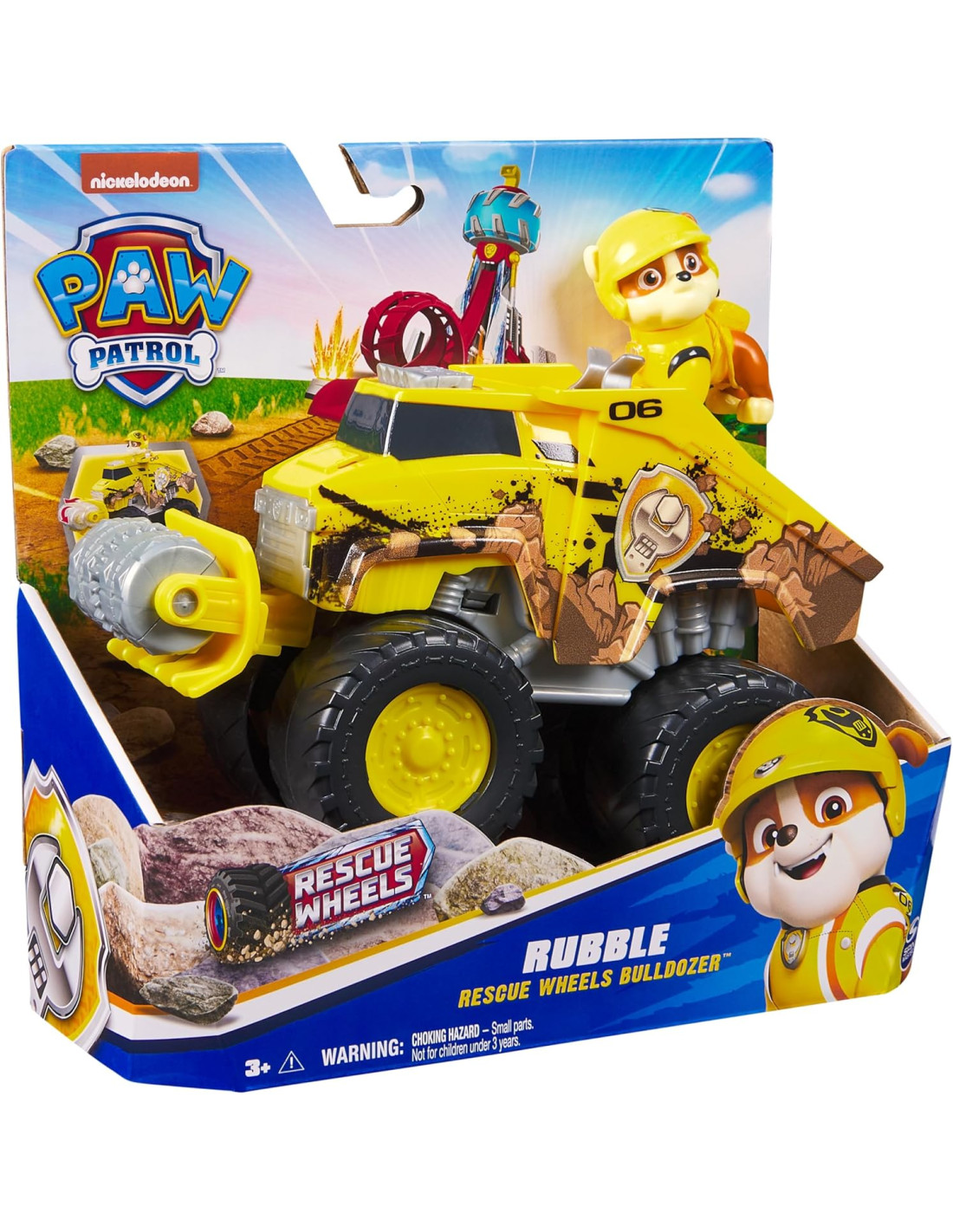 PERSONAGGIO SPECIALE: Rubble indossa la divisa aggiornata Rescue Wheels, completa di casco e zaino. Aggancia Rubble al posto di guida prima di partire per una missione di salvataggio ricca d'azione