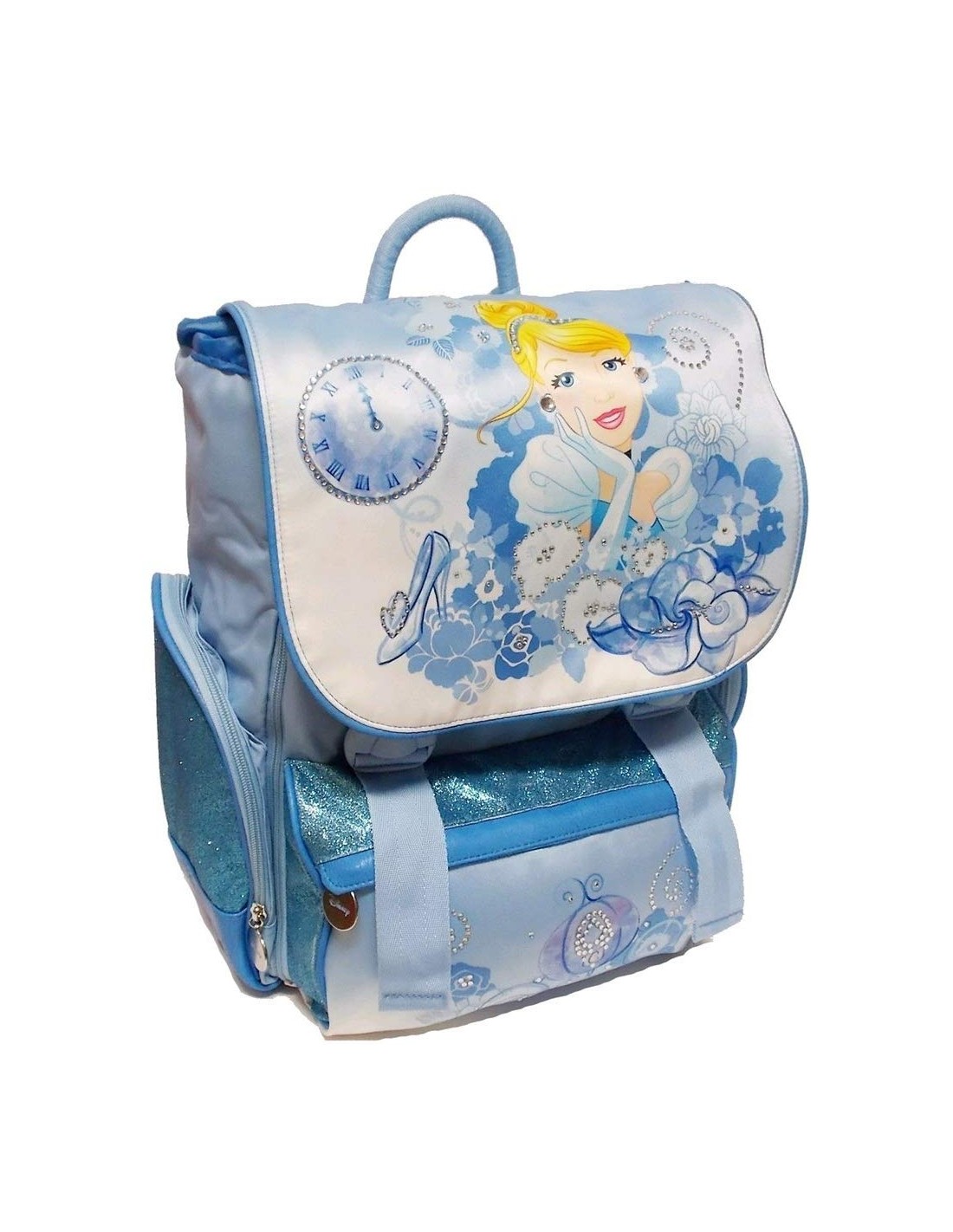 Lo zaino è impreziosito da inserti glitter e da pietrine luccicanti applicate sulla patella, sulla tasca frontale e sulle tasche laterali, per dare un tocco prezioso. Dotato anche di una maniglia imbottita e argonomica per poter essere portato anche a mano.