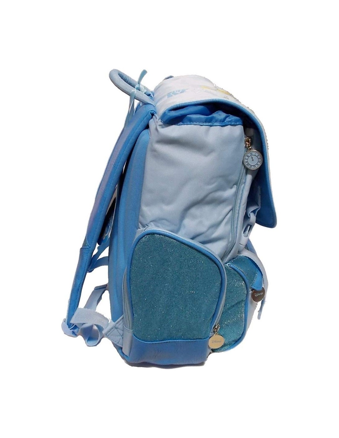 Lo zaino presenta una chiusura a doppia fibbia sotto la pattella anteriore, gli spallacci sono imbottiti, regolabili, uno ha un inserto in tessuto glitter, mentre l'altro ha una taschina in plastica trasparente con un cartoncino per inserire i dati della bambina.