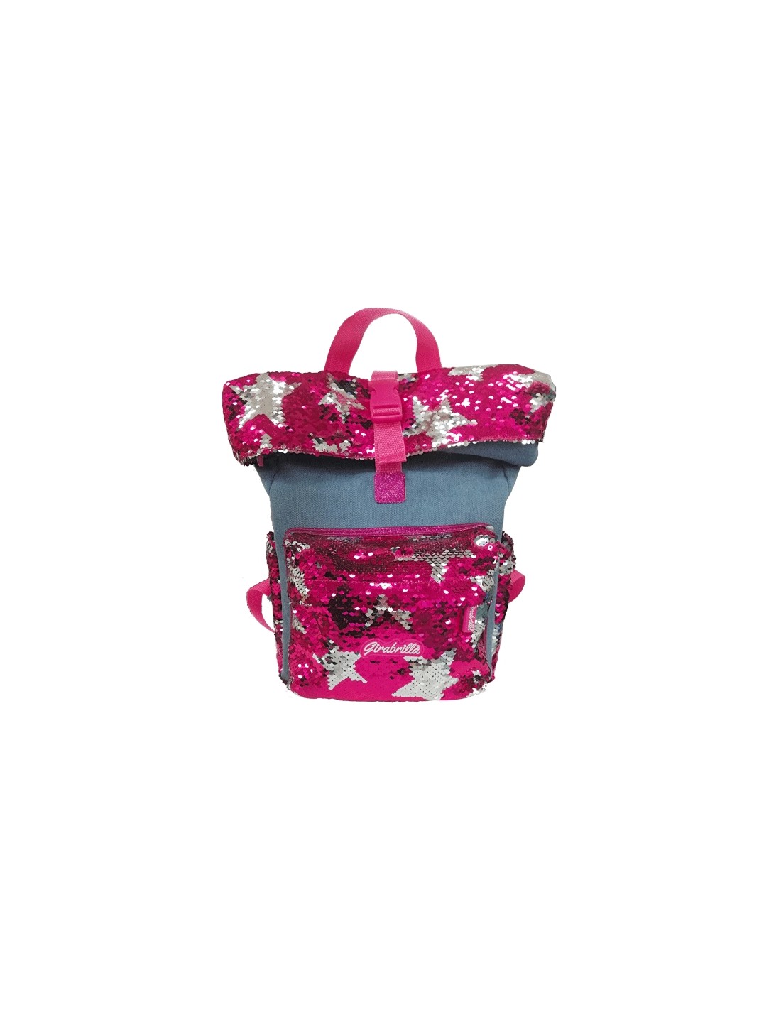 Girabrilla Zaino modello "roll top" decorato con pailettes scintillanti reversibili,in colore magenta e argento, con fantasia a stelle. Fantastico il dettaglio degli spalloni decorati con paillettes, che consente di apprezzare l'effetto estetico anche frontalmente!